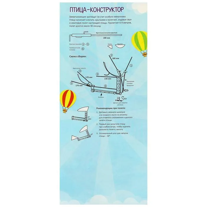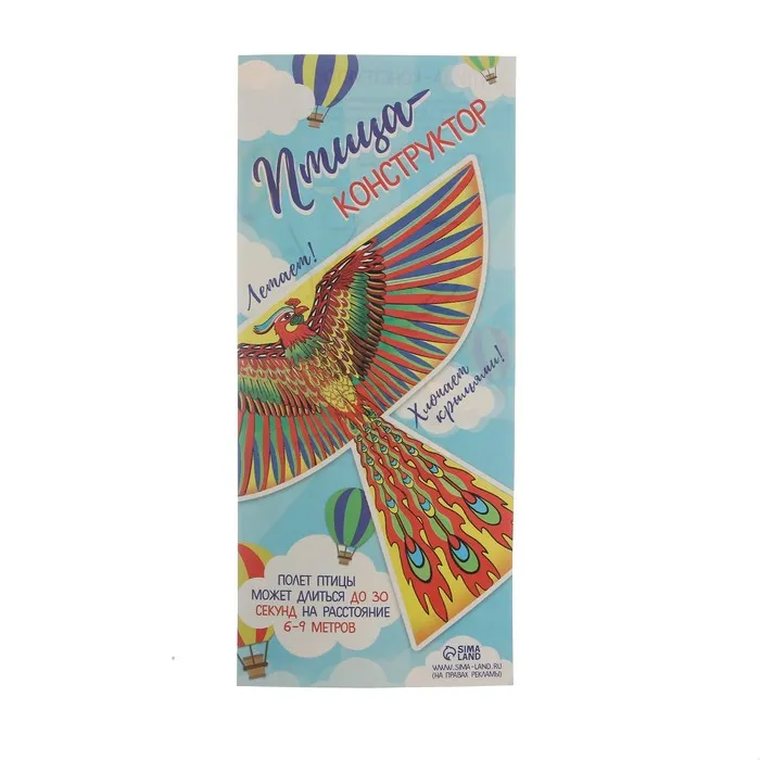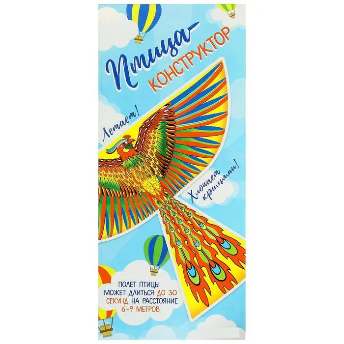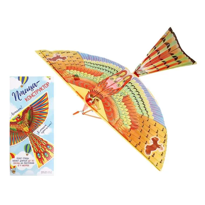 Хотите отправиться в полёт, не отрываясь от земли? Получить неземные ощущения вам поможет летающая птица «Ассорти», цвета МИКС! Мягкое шуршание крыльев, невесомое парение, далёкие облака окутают вас романтикой, а вместе с тем навеют беззаботные мысли о детстве. Это не обычный воздушный змей, а самоходный механизм на резиномоторном двигателе. Модель симулирует взмах крыльев птицы и может самостоятельно лететь около 30 секунд. Когда она взмывает высоко в небо, её почти не отличить от настоящей! Идеальные условия для запуска такой игрушки — штиль или очень слабый ветер. Наслаждайтесь отдыхом на природе всей семьёй!