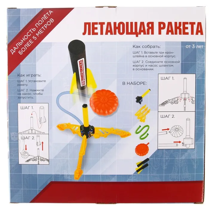 - Простая и безопасная механика – запуск ракеты происходит от давления воздуха.