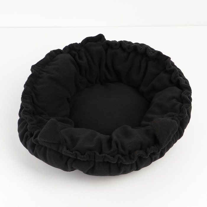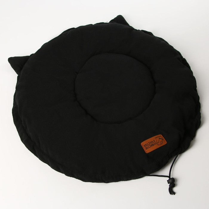 Лежанка-кокон с ушками выполнена из полиэстера. Мягкий и тёплый материал подарит комфорт вашему питомцу. Кокон можно затянуть встроеной веревкой, чтобы сформировались небольшие бортики.