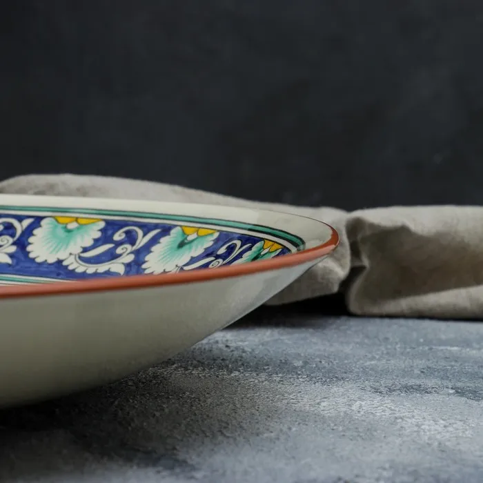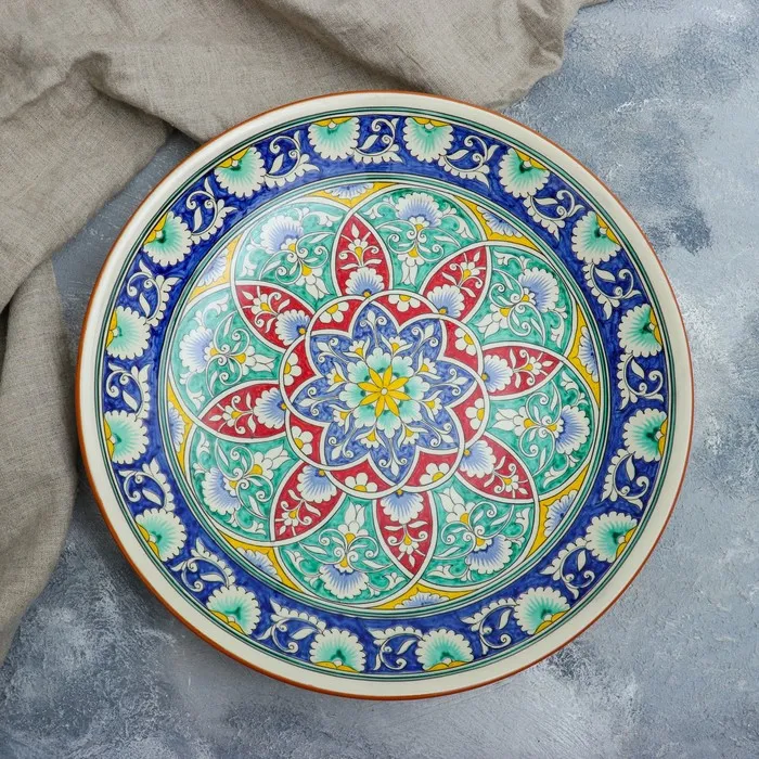 Ляган круглый Риштанская Керамика, 41см, белый с синим, красно-жёлто-зелёный узор — Характеристики