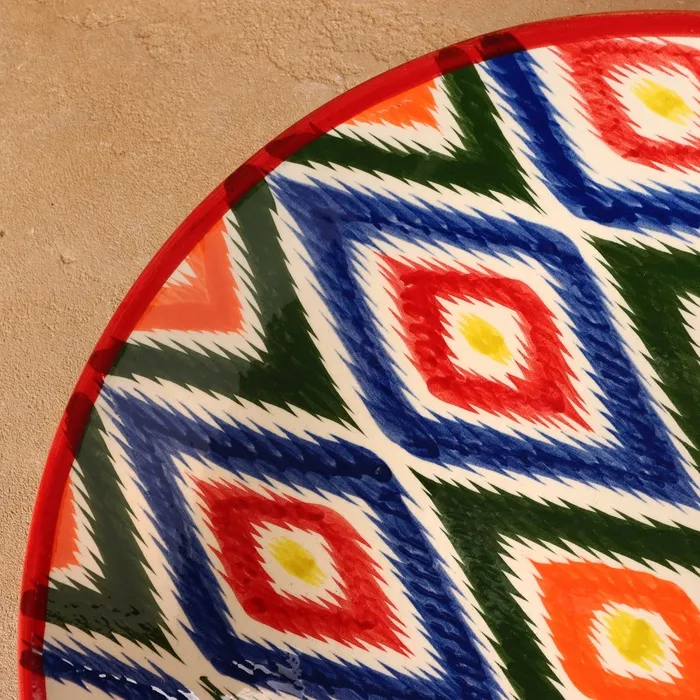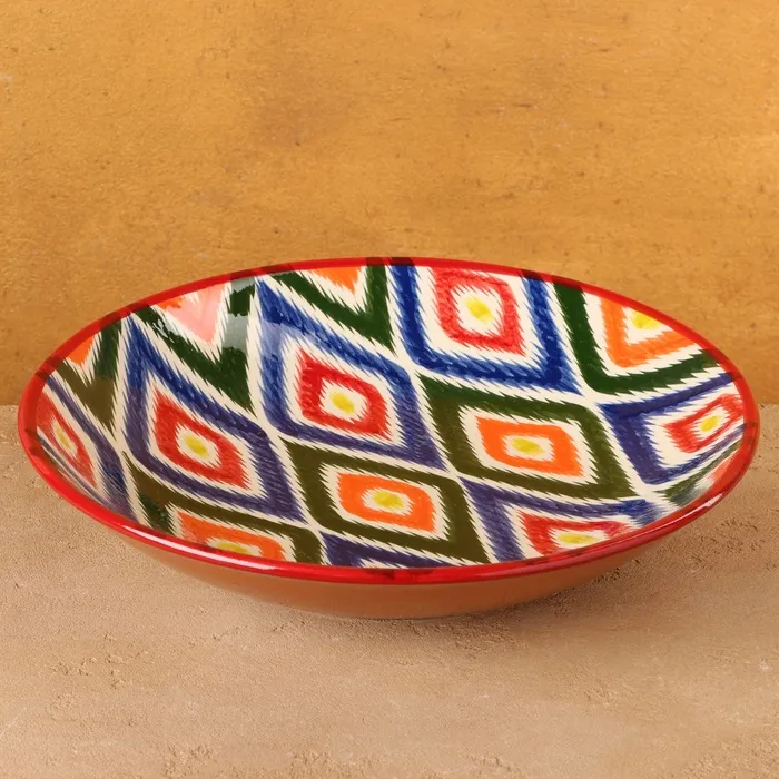 Керамическая глубокая тарелка с орнаментом «Ромбы» — это яркое сочетание узбекского мастерства и геометрической гармонии. Изделие диаметром 33 см выполнено вручную и украшено разноцветным узором, вдохновлённым традиционными мотивами Риштана. Живые оттенки и строгие линии создают баланс между культурой и современным дизайном.