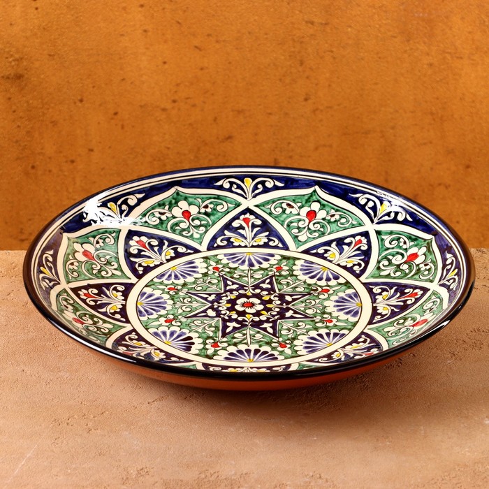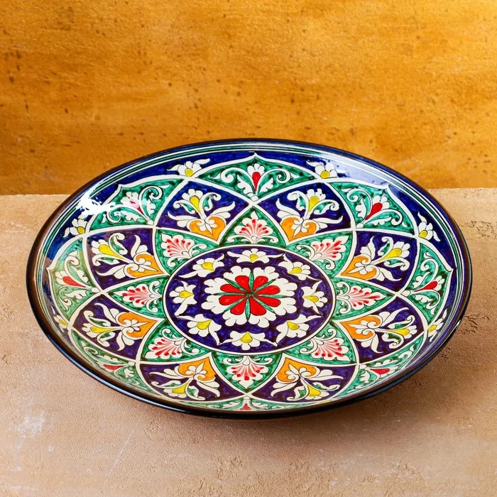 Керамическая плоская тарелка с растительным узором — это отражение узбекской традиции в деталях. Изделие диаметром 32 см выполнено вручную и украшено синим орнаментом, вдохновлённым природными мотивами. Каждая линия на поверхности рассказывает историю мастерства, передаваемого из поколения в поколение.