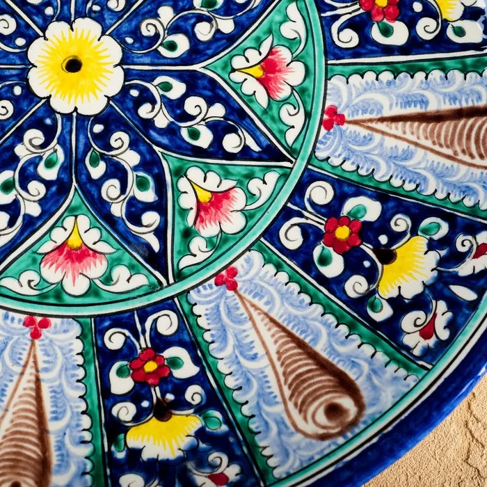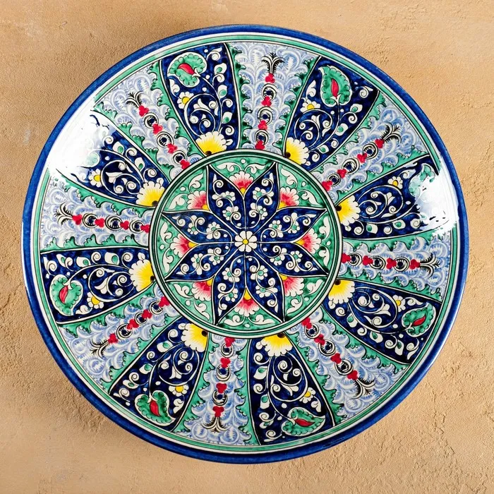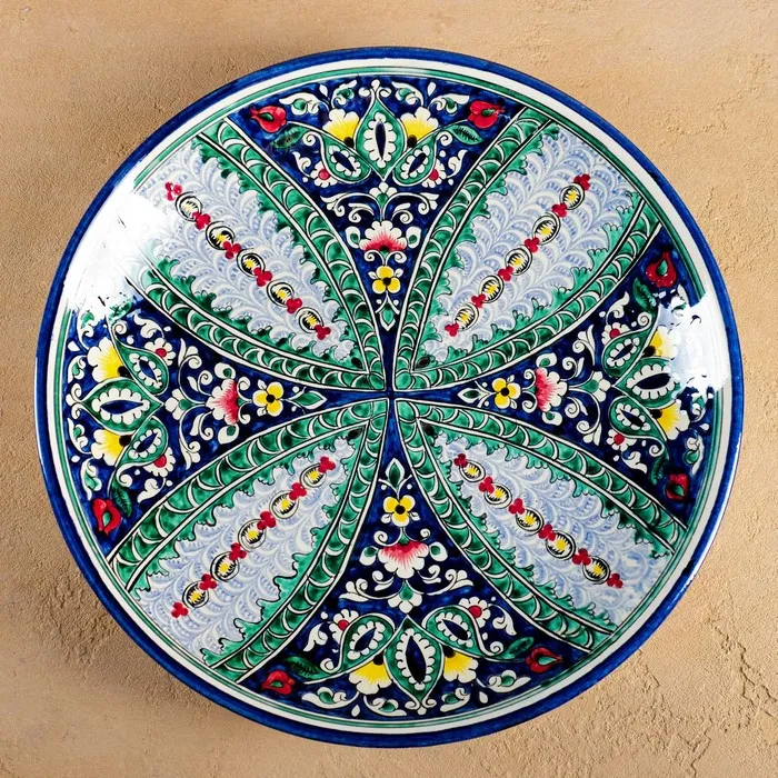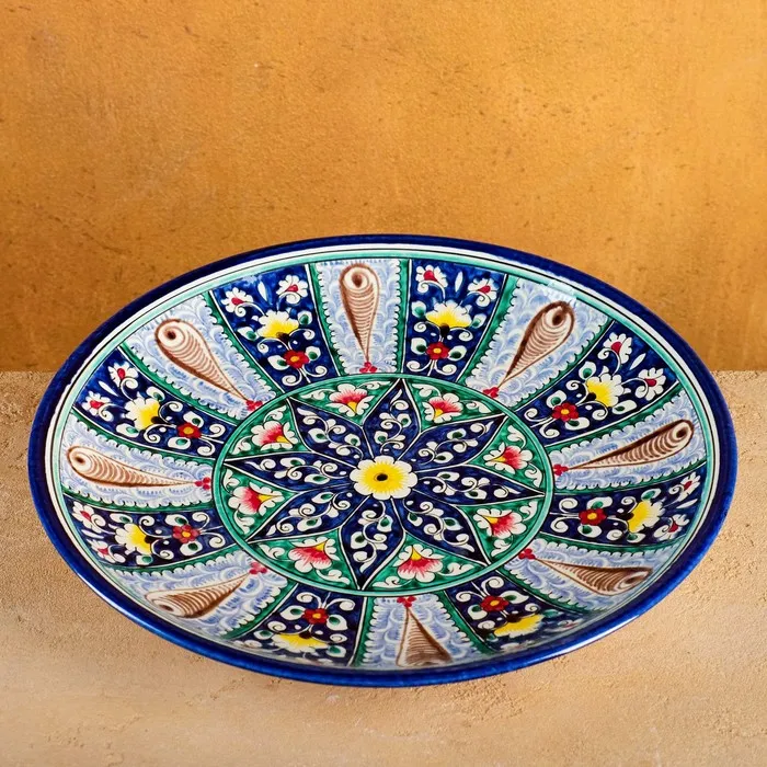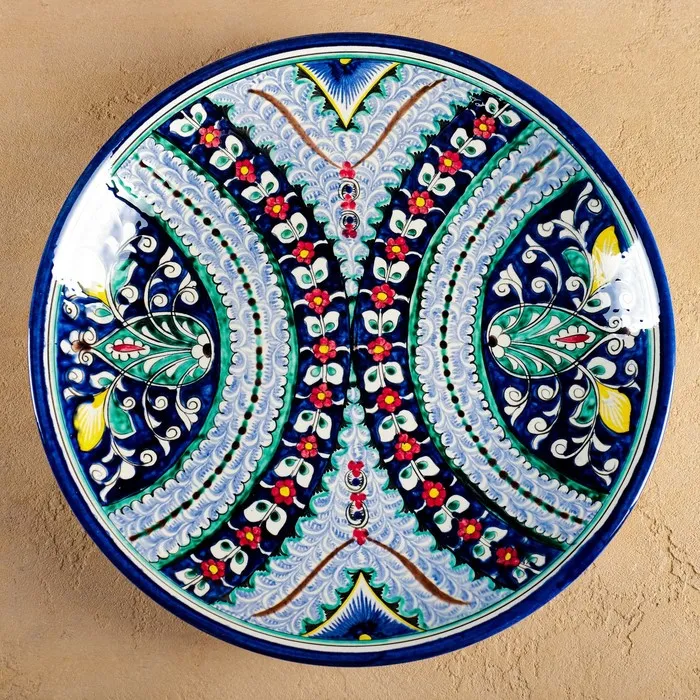 Керамическая плоская тарелка с растительным узором — это живое отражение узбекского ремесла, где каждый лепесток и веточка передают тепло ручной работы. Изделие диаметром 33 см выполнено вручную и украшено синим орнаментом, вдохновлённым природными мотивами Риштана. Гладкая поверхность и яркий рисунок делают его универсальным решением для сервировки и декора.
