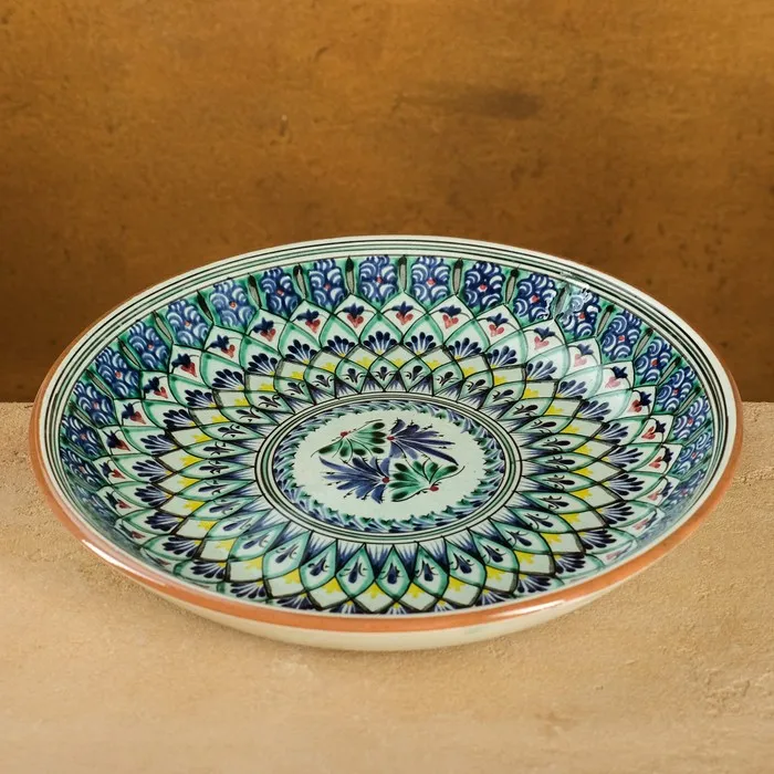 Керамическая глубокая тарелка с растительным узором — это яркое отражение узбекской культуры в миниатюре. Изделие диаметром 25 см выполнено вручную и украшено разноцветным орнаментом, вдохновлённым природными мотивами Риштана. Компактный размер и живой рисунок делают его удобным для сервировки и приятным как подарок.