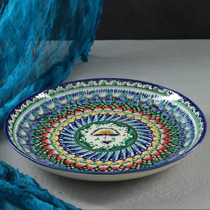 Керамическая тарелка «Узоры. Подарочный» — это яркое отражение узбекского мастерства, где растительный орнамент становится элементом повседневного искусства. Синий фон подчёркивает чёткость линий и глубину ручной росписи, а круглая форма диаметром 28 см делает изделие удобным для сервировки и вручения в подарок. Глубокая чаша сохраняет объём блюда, оставаясь при этом декоративным акцентом.