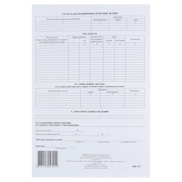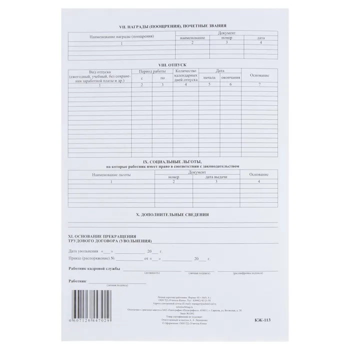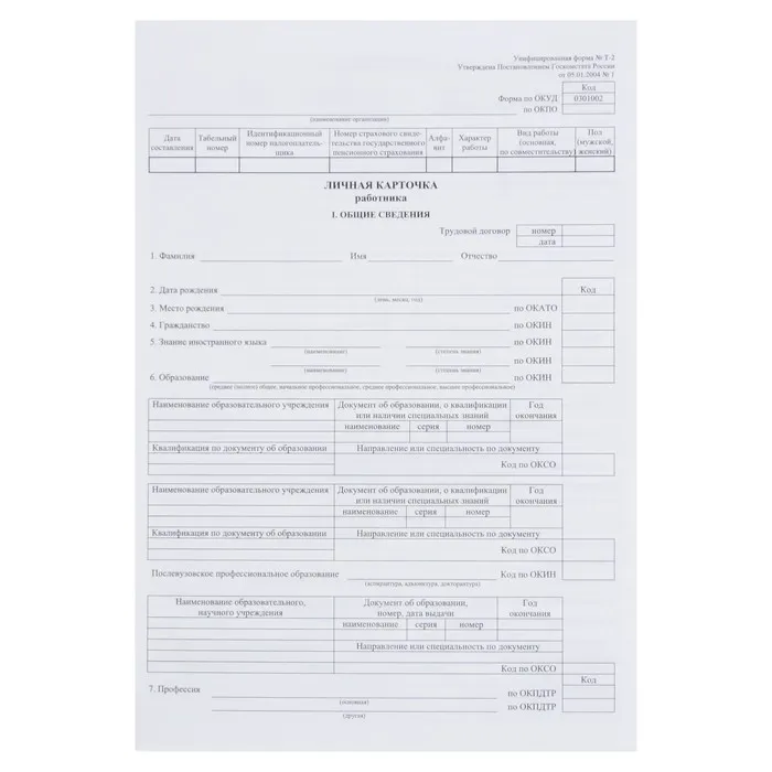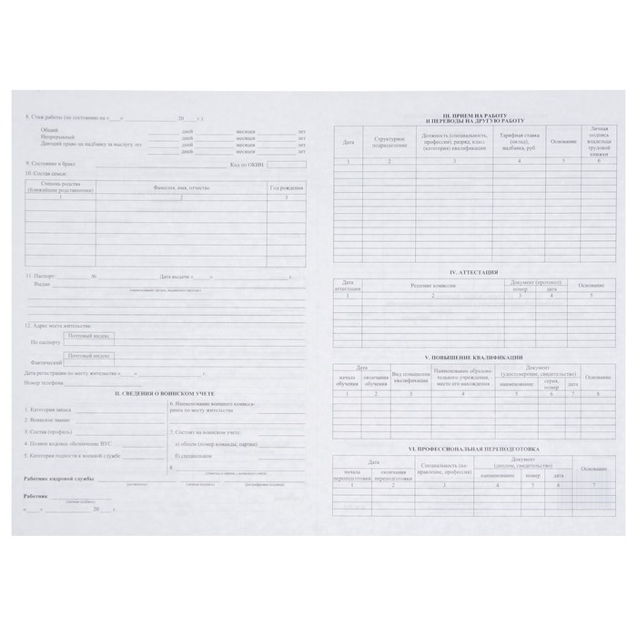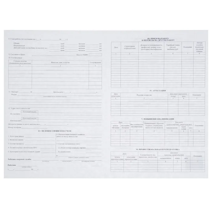 Личная карточка работника, форма Т-2, формат А3 (свёрнут в А4), офсет 160 г/м² — Характеристики