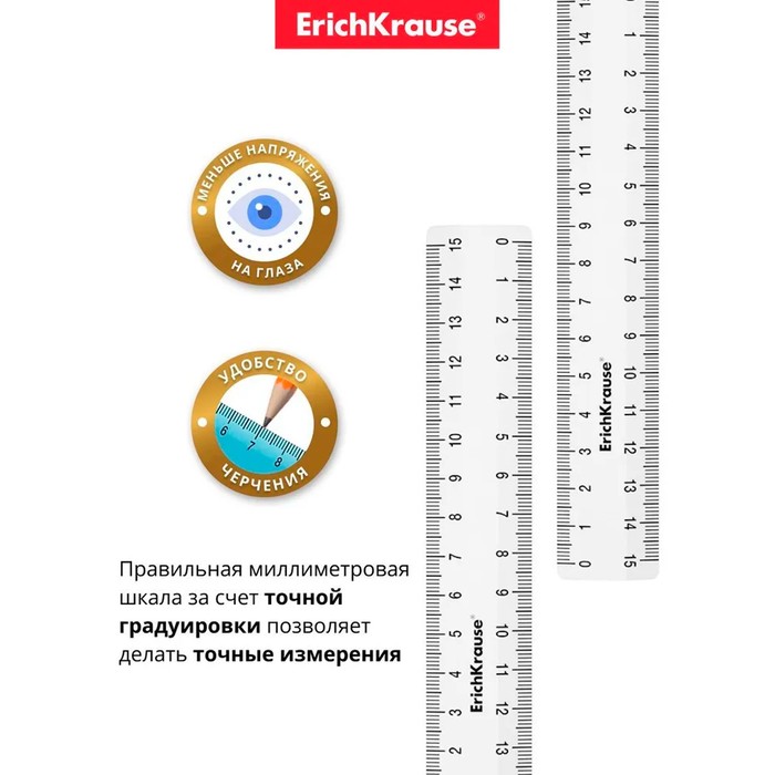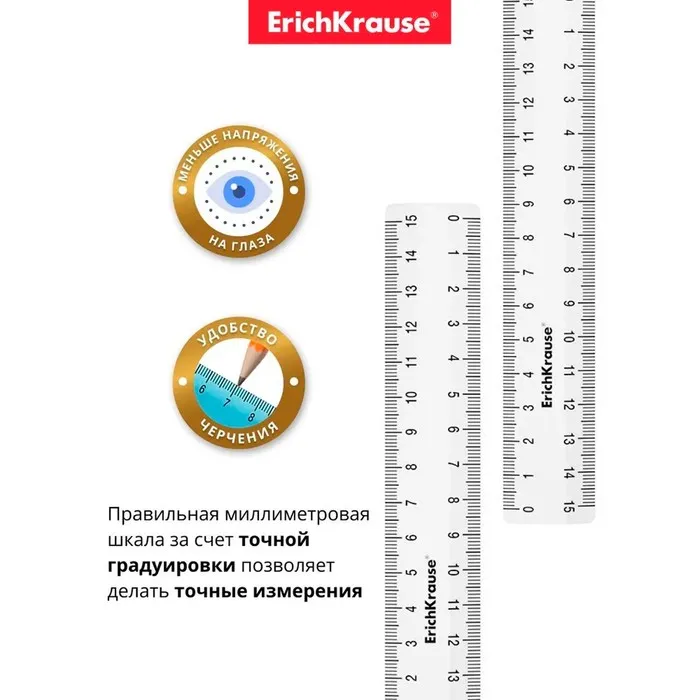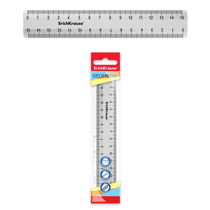 Линейка 15 см ErichKrause "Clear", пластик, двусторонняя шкала, прозрачная, европодвес — Характеристики