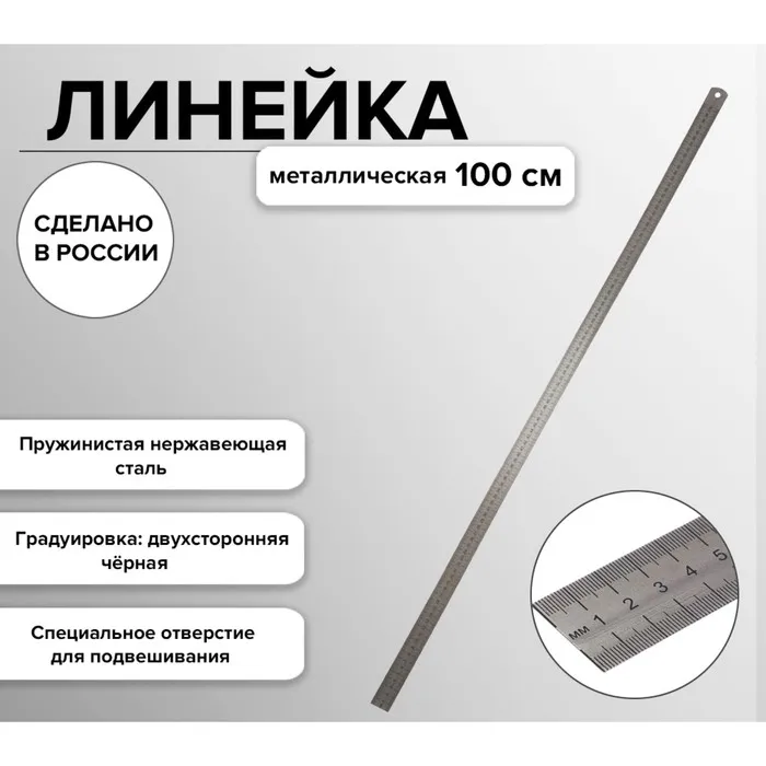 Линейка металлическая предназначена для чертёжных и измерительных работ. Изготовлена из высококачественной пружинистой нержавеющей стали российского производства. Длина шкалы составляет 100 см. Линейка обладает чёткой двухсторонней разметкой, что делает её удобной в использовании. Удобная, информативная разметка для комфортной работы не сотрётся даже при длительной и жёсткой эксплуатации. Упакована в ПВХ чехол.