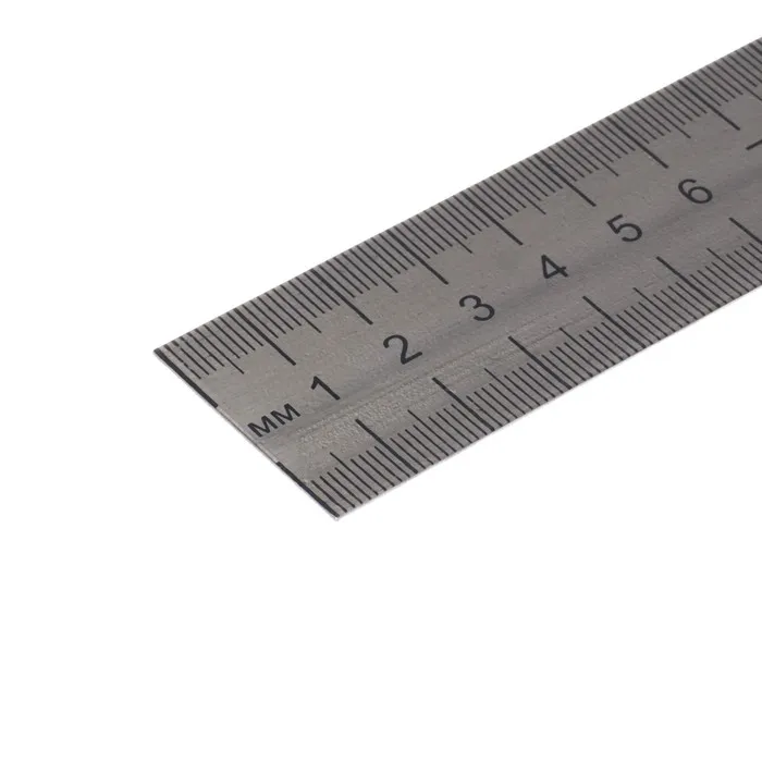 Прочная металлическая линейка выполнена из пружинистой нержавеющей стали, устойчивая к коррозии. Линейка двусторонняя и имеет две шкалы на каждой стороне. Разметка чёткая нанесена на металлическое основание методом гравировки, поэтому не стирается и остаётся читаемой даже после длительной эксплуатации.