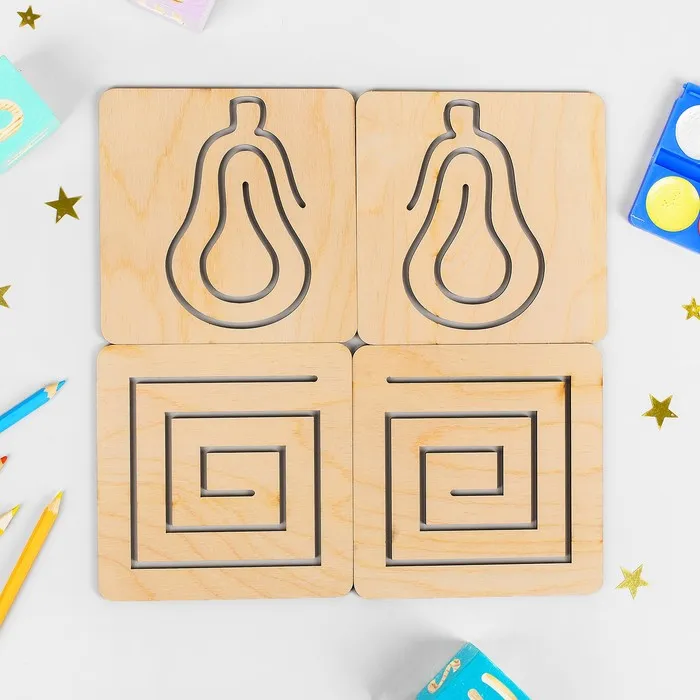 Ребёнок берёт в каждую руку по инструменту для рисования и одновременно обводит контуры на дощечках. Это простое, но эффективное упражнение, которое можно выполнять дома или в детском саду. Набор подходит как для индивидуальных занятий, так и для групповых игр.