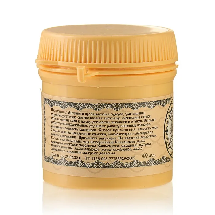 Состав: воск пчелиный, мёд натуральный Кавказский, масло календулы, экстракт морозника Кавказского, масляный экстракт конского каштана, масло лавровое, масло камфорное, масло зверобойное, масляный экстракт девясила.
