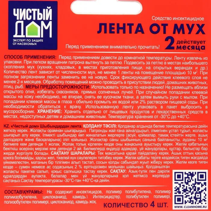 Липкая лента от мух Чистый дом, с аттрактантом содержит специальный клей, который обладает высокой клейкостью и удерживает насекомых на поверхности ленты. Также в составе присутствует аттрактант - вещество, привлекающее мух и других насекомых. Это делает ленту еще более эффективной в ловле насекомых.