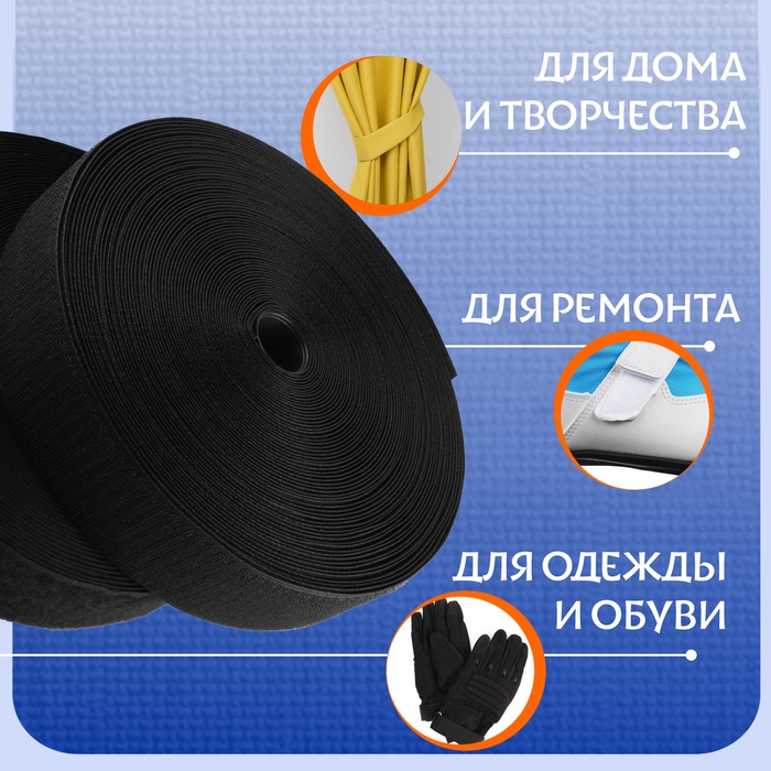 Пришивная липучка 50 мм чёрного цвета — прочный и вместительный крепёж для масштабных швейных работ, текстильного производства и ремонта. Лента длиной около 25 метров подходит для проектов, где важна выносливость застёжки: пошив одежды, обивка мебели, производство сумок и спортивного инвентаря. Чёрный цвет гармонично сочетается с тёмными тканями и устойчив к загрязнениям.