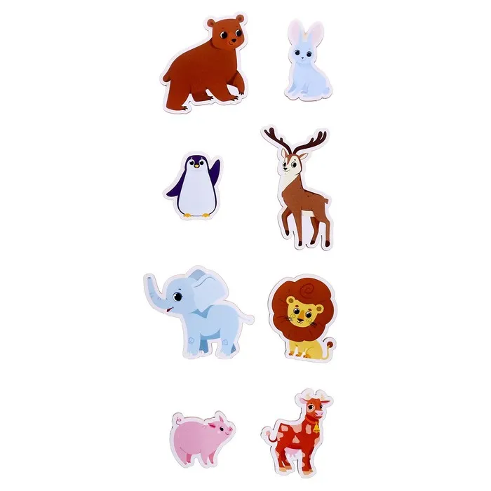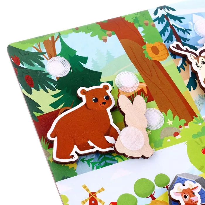 - В наборе вы найдёте 8 липучек с животными и 4 поля с разными локациями.