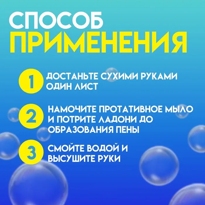 Способ применения: Достаньте сухими руками один лист, намочите портативное мыло и потрите ладони до образования пены, смойте водой.