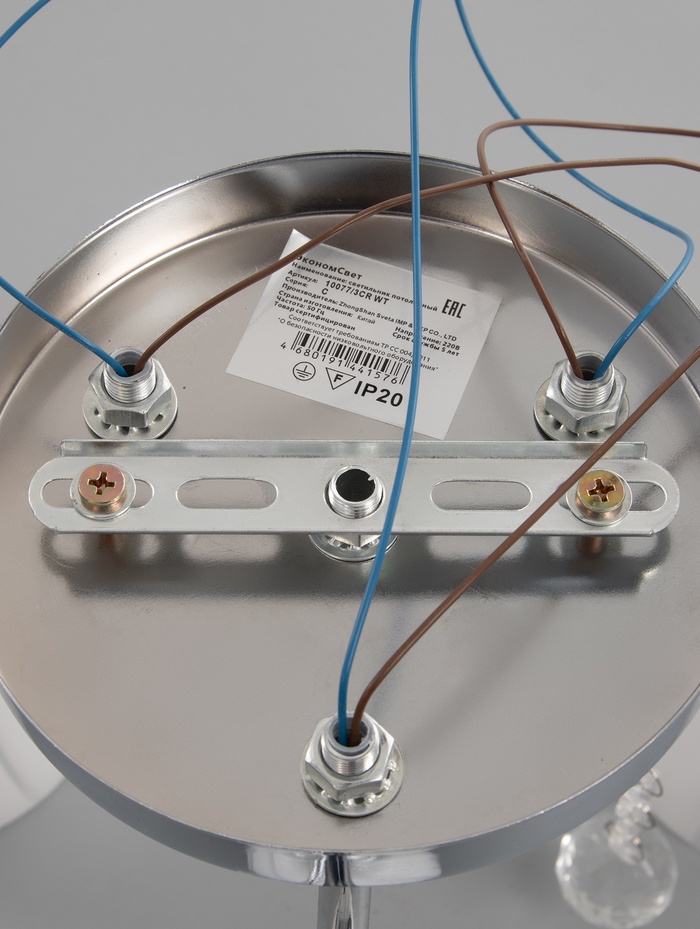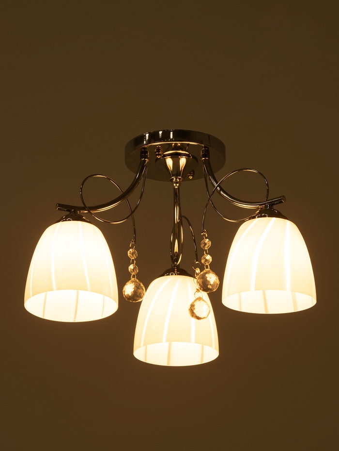 - Гибкость в выборе ламп: В люстре установлены три патрона Е27. Вы можете использовать лампы накаливания, энергосберегающие или современные филаментные лампы, чтобы создать нужную атмосферу и контролировать энергопотребление. Для монтажа на натяжной потолок рекомендуются светодиодные лампы — они не нагревают конструкцию.