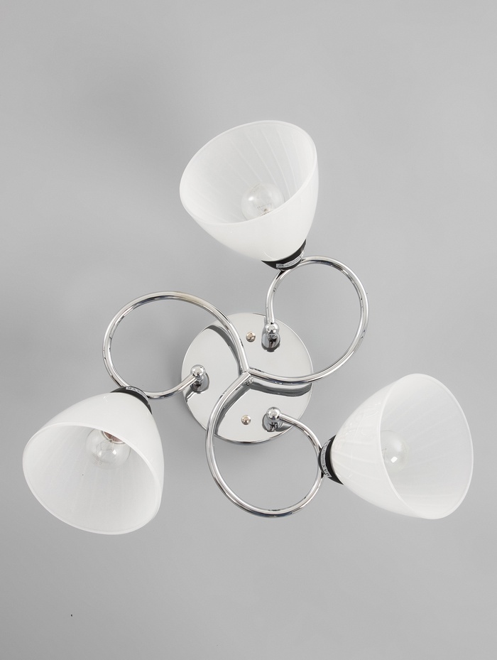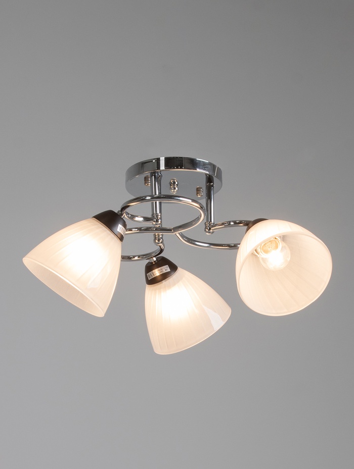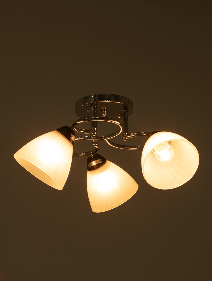 Строгий свет для уютных интерьеров Люстра на три плафона 50×50×23 см — это классический потолочный светильник с металлическим основанием и стеклянными абажурами. Конструкция создает равномерное освещение, подходящее для отдыха и общения.