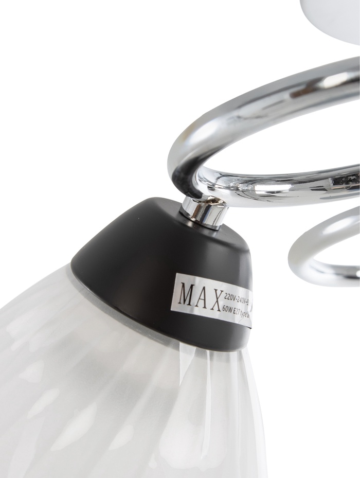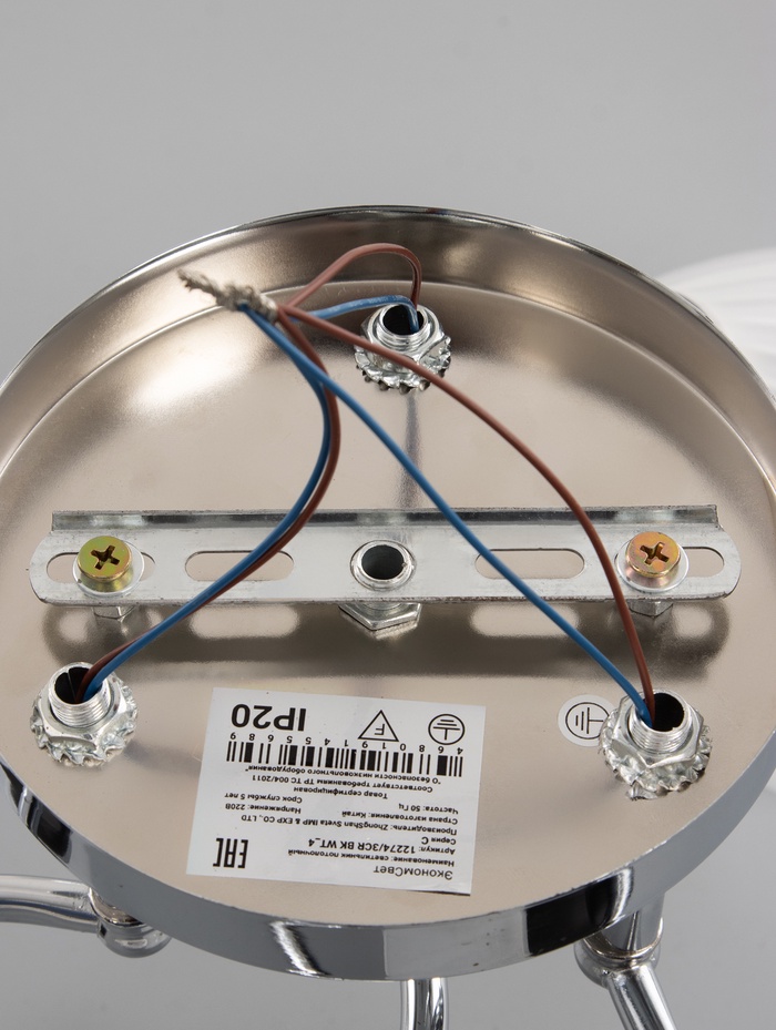 - Три плафона под лампы E27: В каждый патрон можно установить лампу накаливания, филаментную или энергосберегающую мощностью до 40 Вт. Светильник совместим с натяжными потолками при использовании светодиодных источников света — они не нагревают конструкцию.
