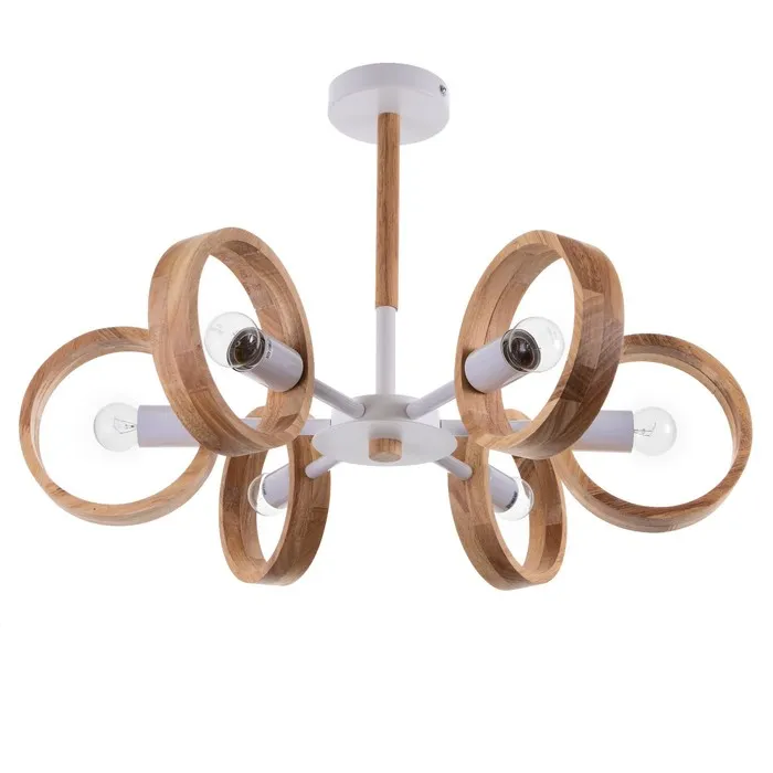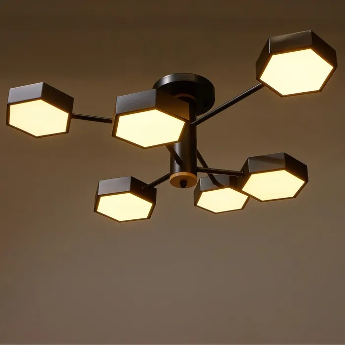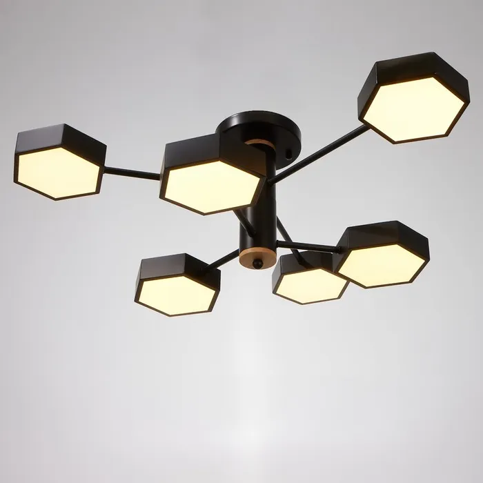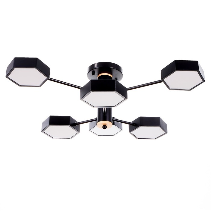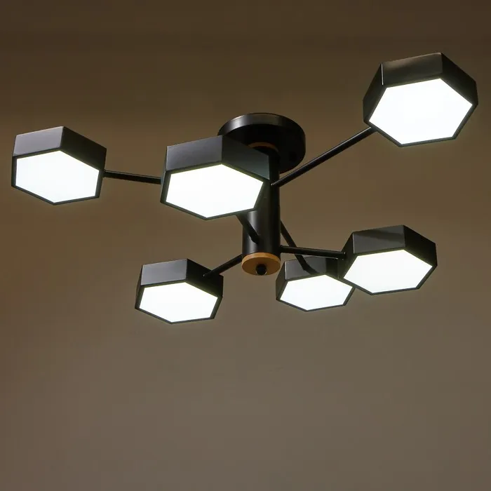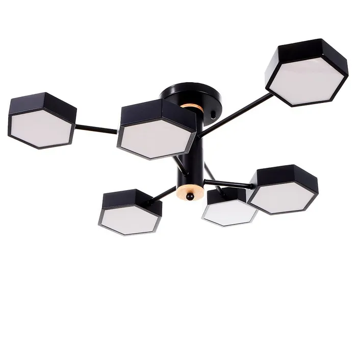 Свет, который держит пространство в фокусе. Потолочная LED-люстра с регулируемой температурой света – эффективное решение для гостиной, кухни или спальни до 15 м². Чёрный металлический каркас с элементами дерева, шесть встроенных светодиодных модулей и шестиугольные плафоны из пластика и металла создают насыщенное, направленное освещение без потерь.