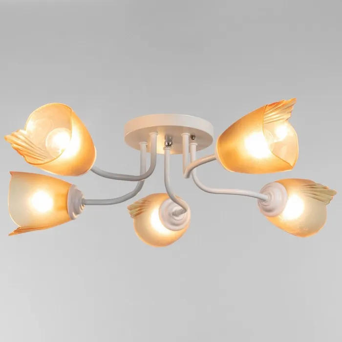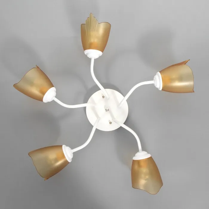 Потолочная люстра «1341001/5BR» с белым основанием и коньячными плафонами станет стильным решением для освещения различных помещений. Минималистичный дизайн и функциональность делают её подходящей для разных интерьеров.