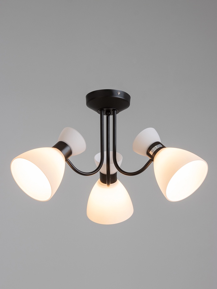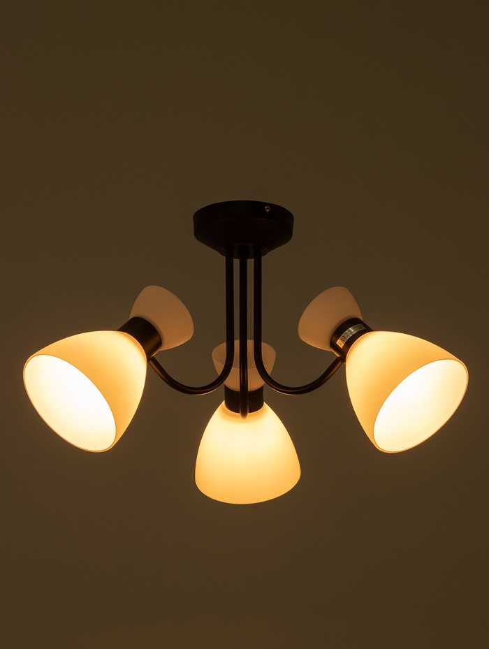 - Трехрожковая конструкция: Три стеклянных плафона распределяют свет равномерно. В каждую лампу устанавливается источник света с цоколем E27 мощностью до 60 Вт. Для ежедневного использования выбирайте филаментные или светодиодные лампы — они меньше нагреваются.