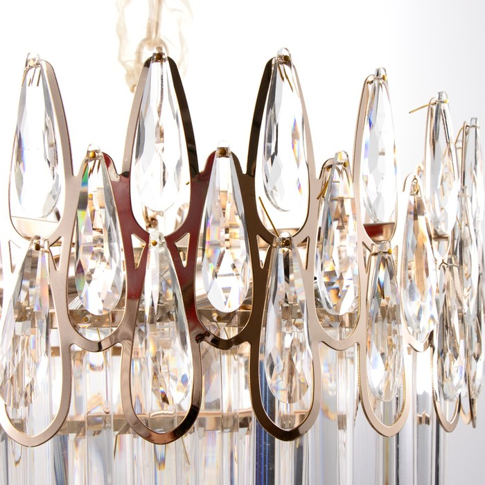 Свет, подвешенный в золотой оправе. Подвесная люстра с девятью прозрачными стеклянными плафонами и золотистым металлическим каркасом — масштабное решение для гостиной, большого зала, кухни или спальни до 18 м². Её компактные габариты в ширину при значительной высоте создают эффект вертикального акцента, характерный для стиля неоклассики и дизайнерского модерна.