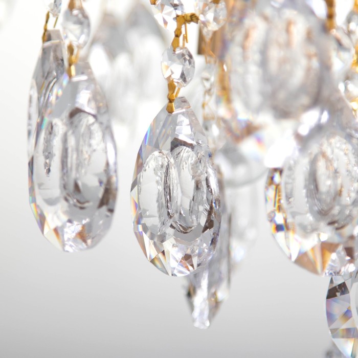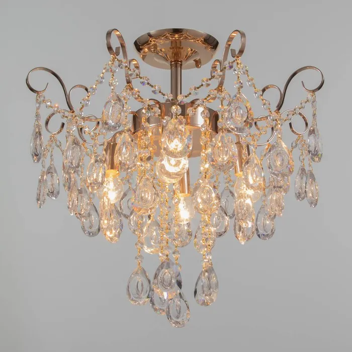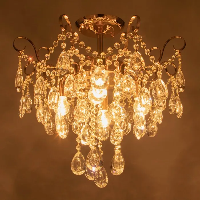 - Прозрачные хрустальные элементы: Хрустальные подвески преломляют свет, создавая изысканные блики и радужные reflections. Это характерная особенность качественных хрустальных светильников.