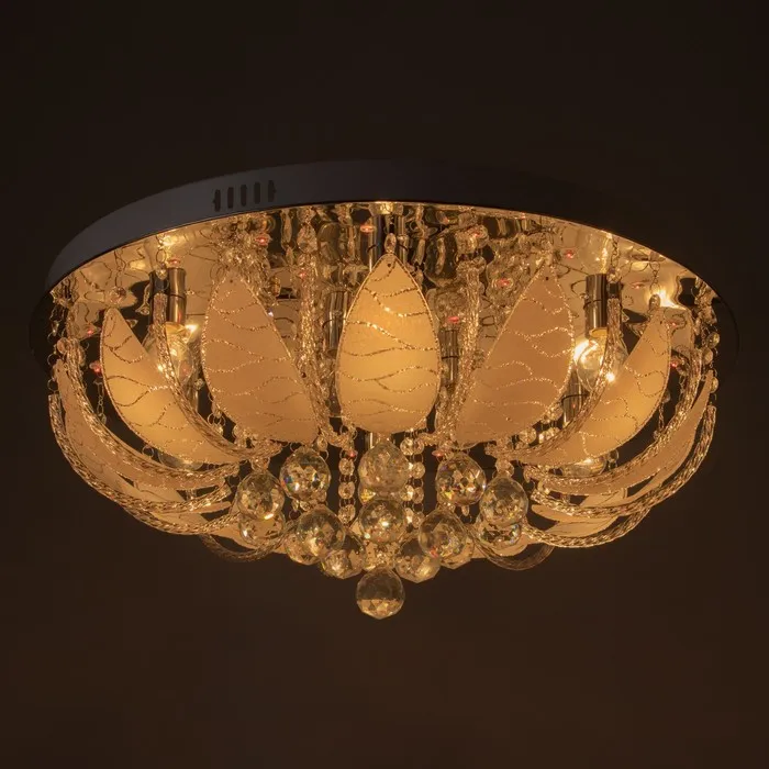 - Компактная конструкция (50×50×25 см): Люстра легко помещается даже в квартире с низкими потолками. Не выглядит массивно, но остаётся заметным элементом оформления за счёт стиля «торт» и хрустального эффекта.
