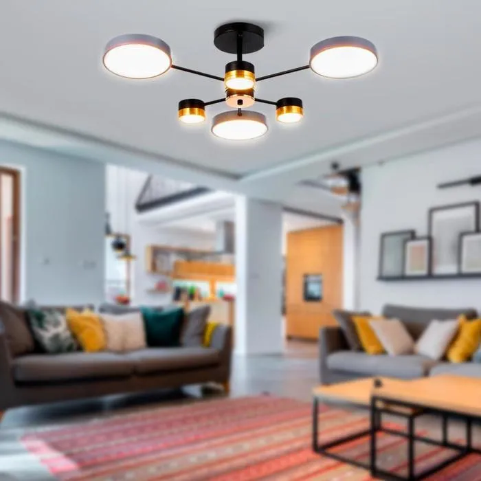Изделие выполнено из качественного металла, пластика и светодиодов. Срок службы люстры в домашних условиях — 20 000 часов. Подходит для помещений с низкими потолками и для натяжных потолков. Осветит комнату площадью до 7 м².