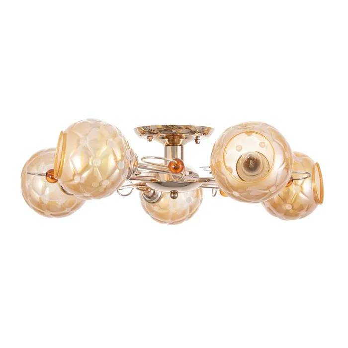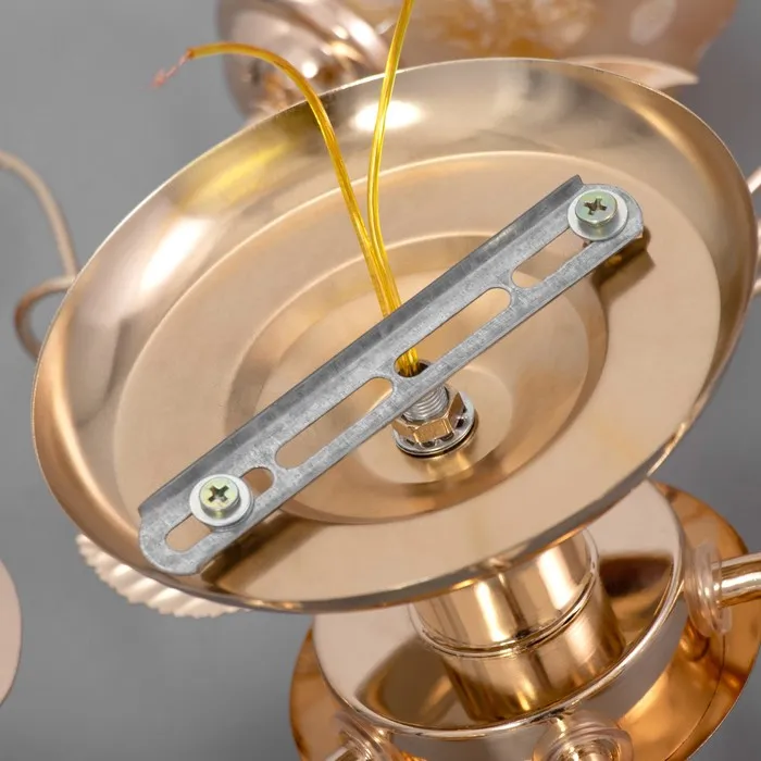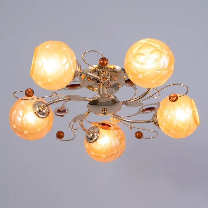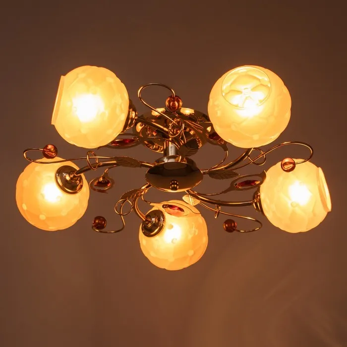 - Полушарные плафоны: Пять золотых полусферических плафонов излучают мягкий свет, создавая уютную атмосферу в любом помещении.