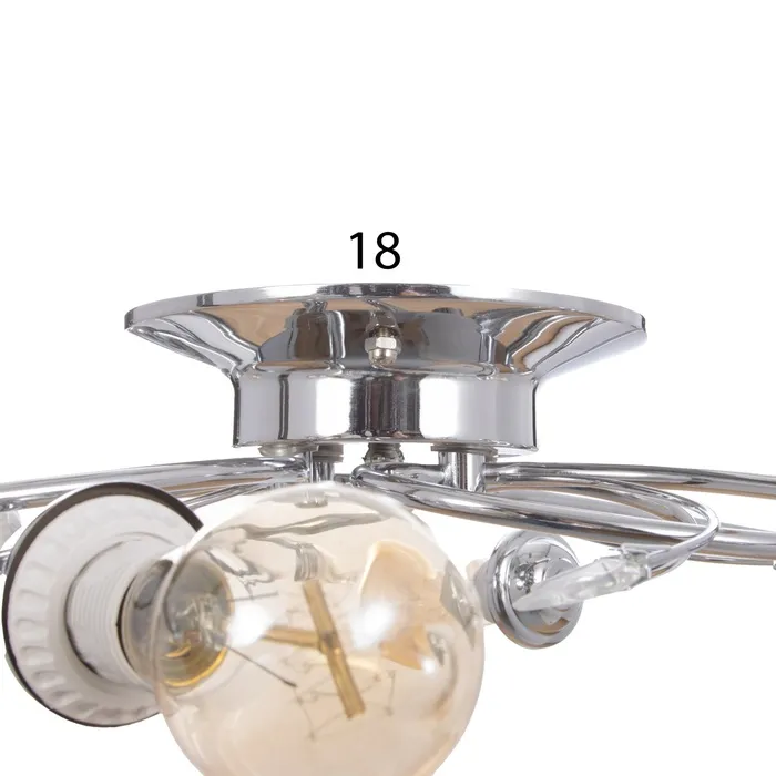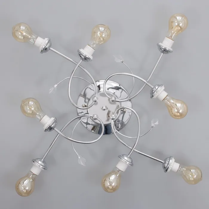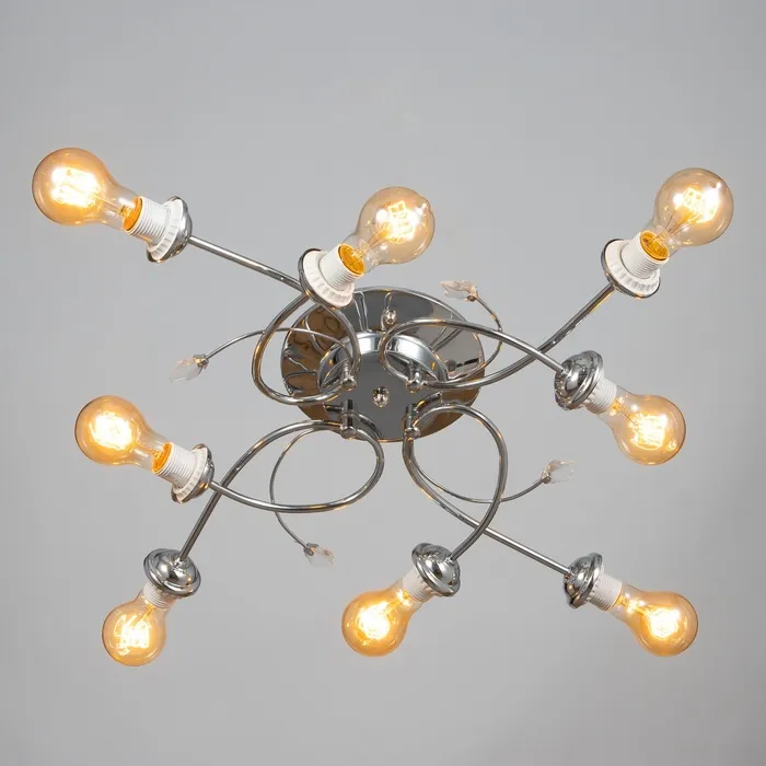 - Элегантный дизайн: Хромированные ветви и отсутствие плафонов создают воздушный и легкий образ, подчеркивающий простор и высоту помещения.