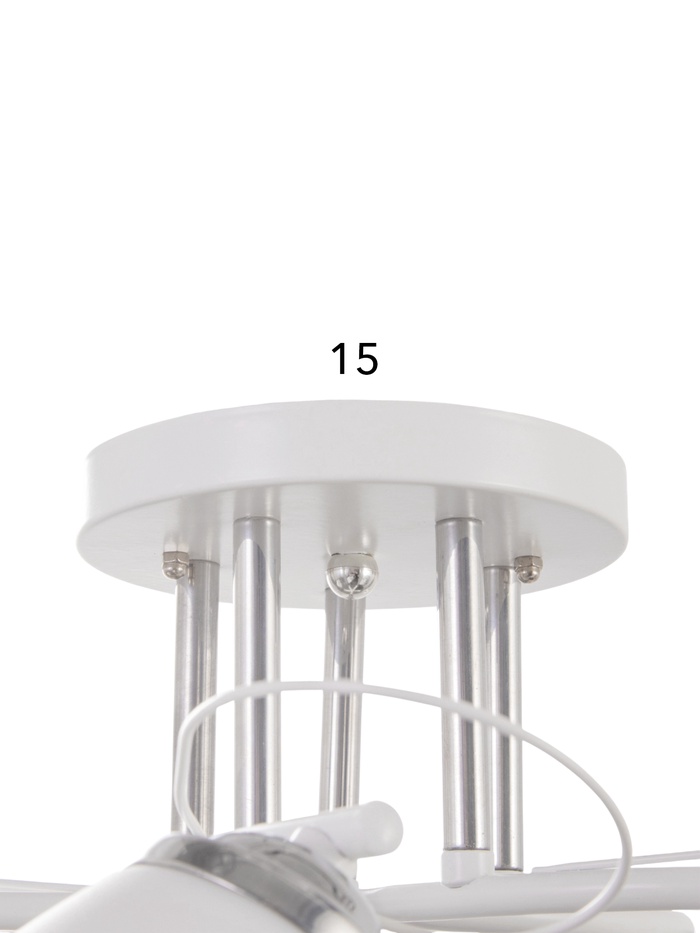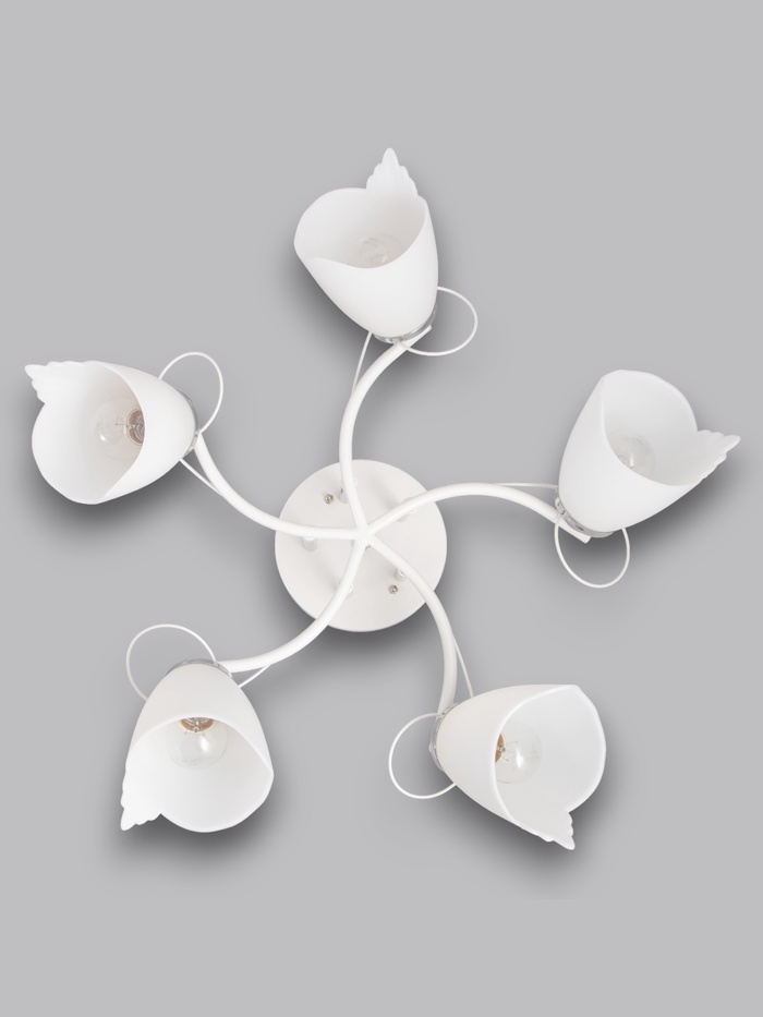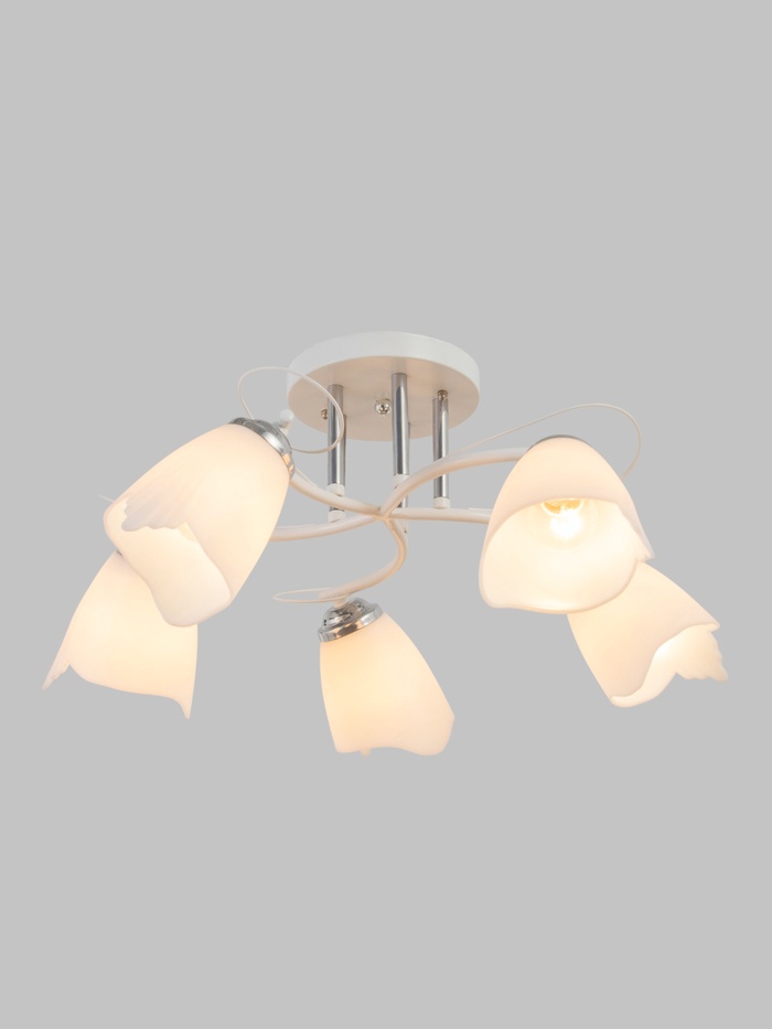 Свет, собранный в лёгкий цветок. Потолочная люстра с пятью белыми плафонами — современное решение для гостиной или спальни до 20 м². Компактная (50×25 см), но мощная по световому охвату, она сочетает белые конусные плафоны и хромированную арматуру, создавая чистый, невесомый образ. Лампы не входят в комплект — подойдут энергосберегающие или филаментные с цоколем E27 до 15 Вт.