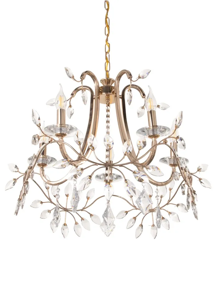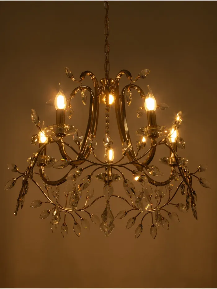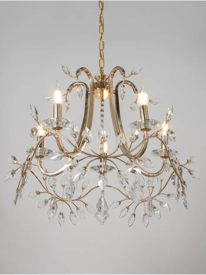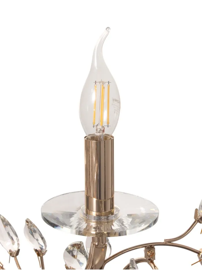 - Элегантный дизайн: золотое основание и отсутствие плафонов придают люстре изысканный и роскошный вид, который гармонично впишется в классический интерьер.