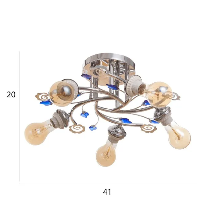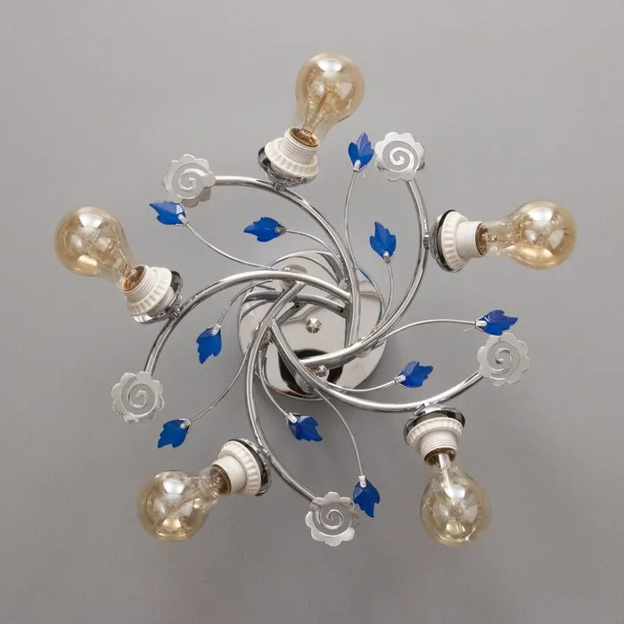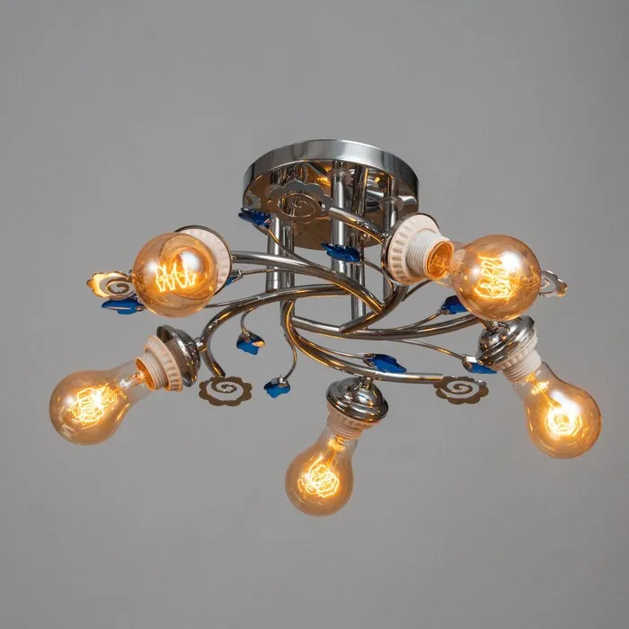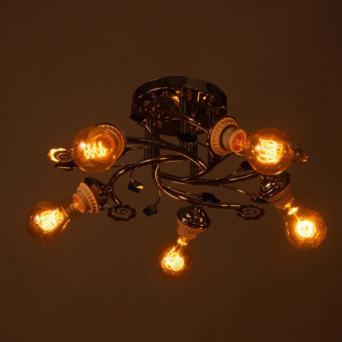 Представляет собой уникальное сочетание элегантности и функциональности. Изготовленная из металла, украшена декоративными элементами в виде листьев, что придает ей утончённый и благородный вид. Люстра оснащена пятью лампами накаливания, расположенными несимметрично, что обеспечивает мягкое освещение, идеально подходящее для различных типов помещений, таких как большая зала или гостиная.