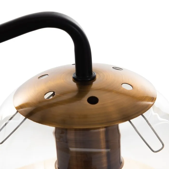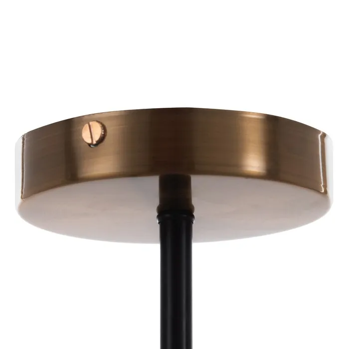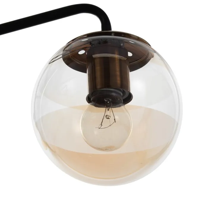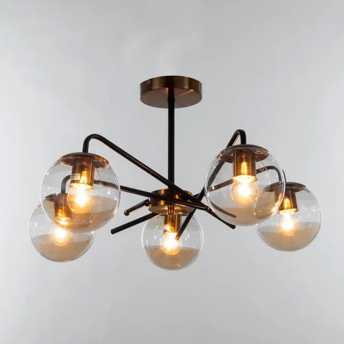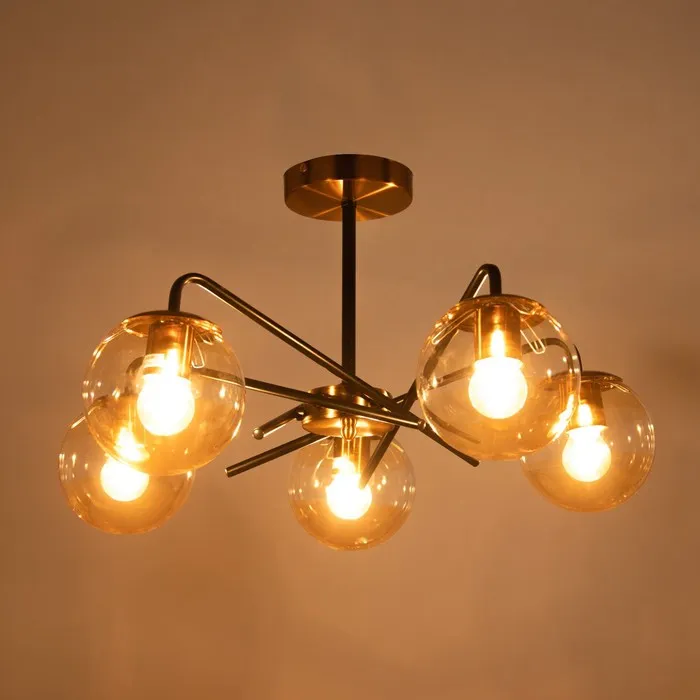 - Янтарные стеклянные рассеиватели в форме шара: Мягко играют с оттенками света, создавая тёплую и уютную атмосферу. Форма и цвет делают люстру частью декоративного решения пространства.