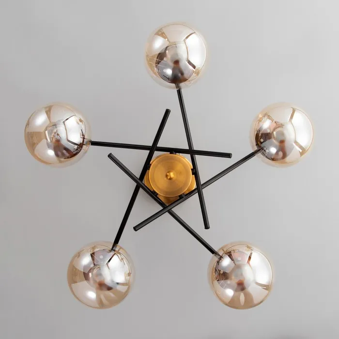 Свет, который становится акцентом интерьера! Потолочная люстра с пятью лампами и контрастным дизайном — это мощное и стильное освещение для гостиной, спальни, кухни или прихожей площадью до 15 м². Золото и чёрный в сочетании с янтарными стеклянными шарами создают эффект современной роскоши без излишней вычурности.