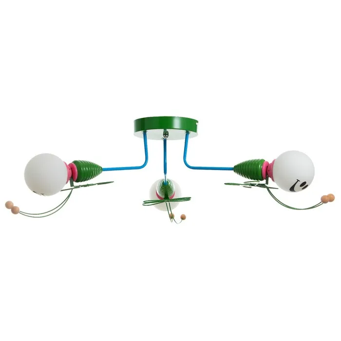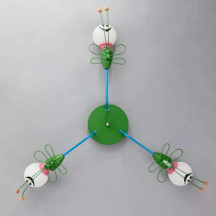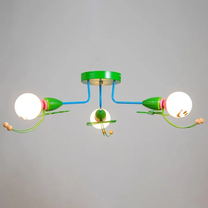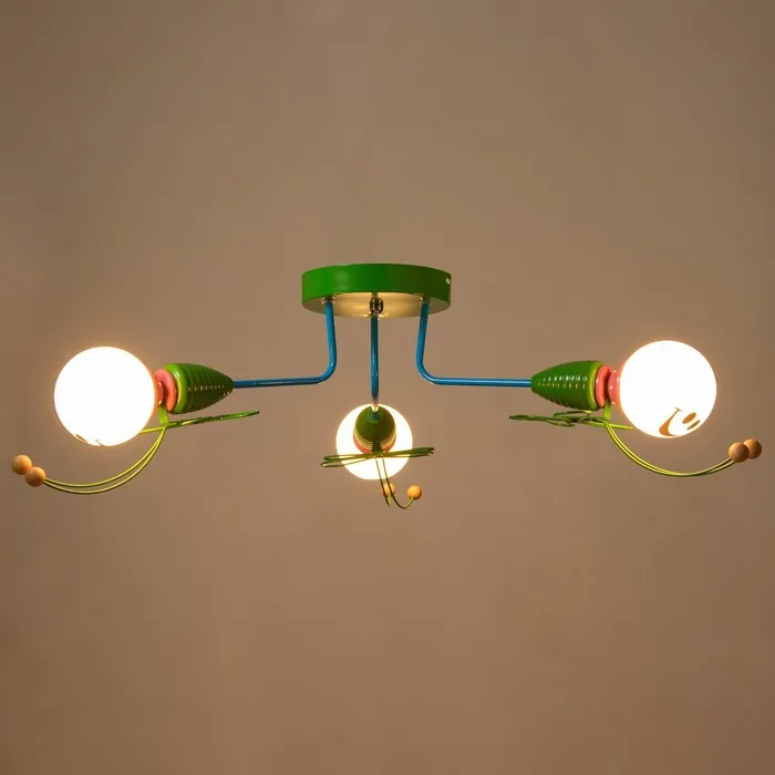 Свет, в котором живут букашки. Потолочный светильник с тремя лампами и зелёным металлическим основанием в виде насекомых – яркое и игривое решение для детской комнаты. Три лампы E27 расположены по углам квадрата, а фигурные элементы в виде букашек превращают освещение в часть сказки, а не просто в техническое устройство.