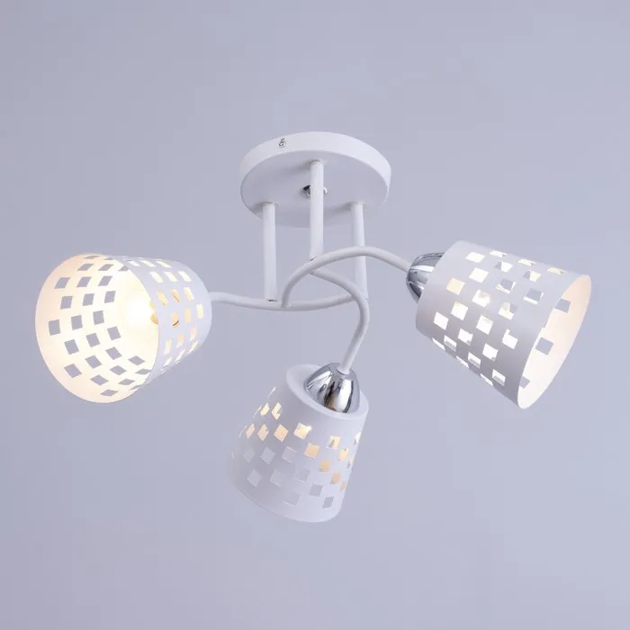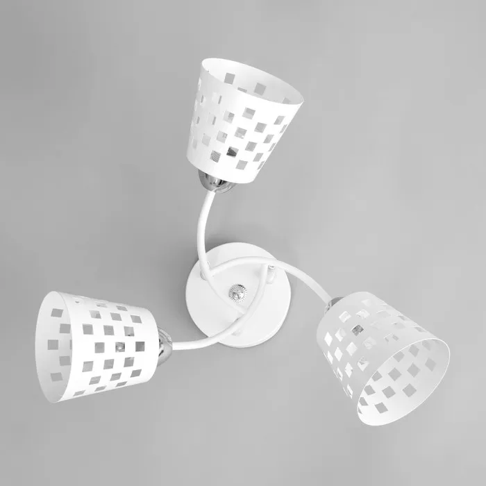 Металлическое основание в белом цвете выглядит лаконично и современно, подчеркивая высокое качество исполнения. Размеры светильника позволяют ему органично смотреться в помещениях разной площади. Плафоны направляют свет в стороны, создавая мягкое и равномерное освещение.