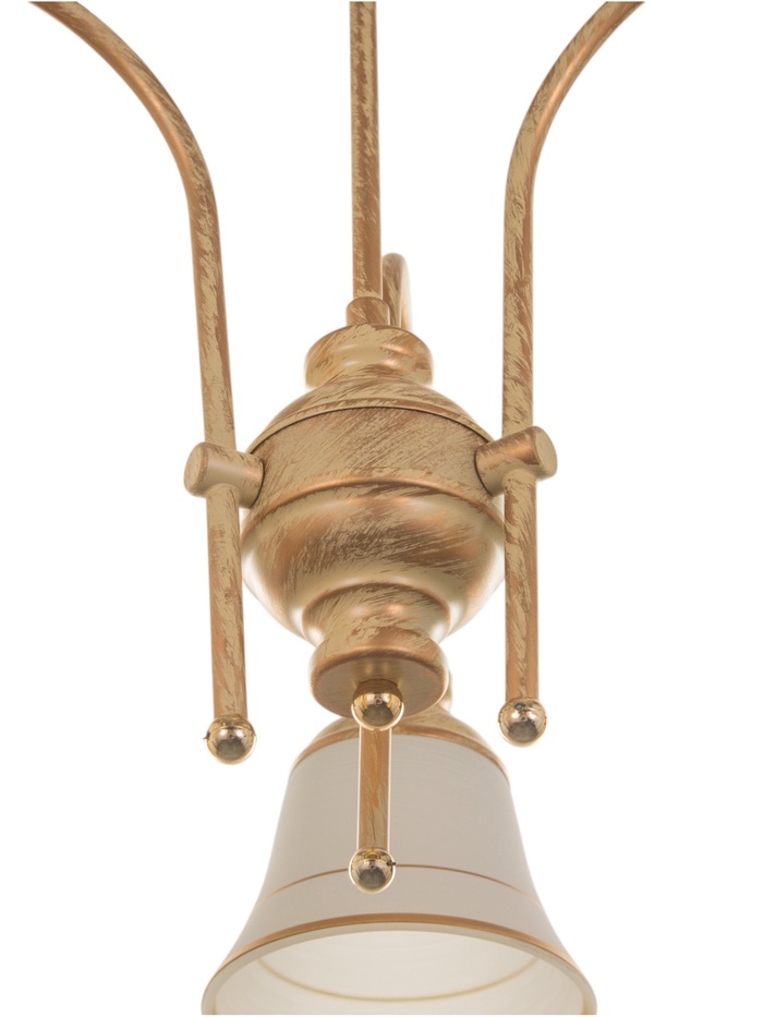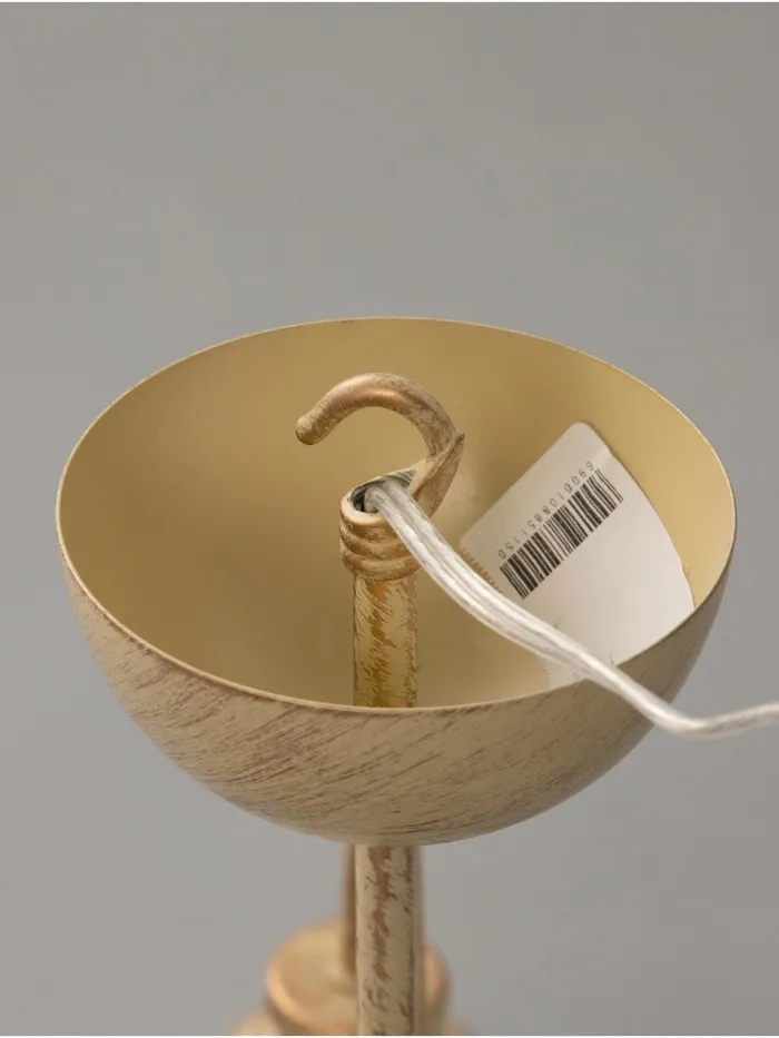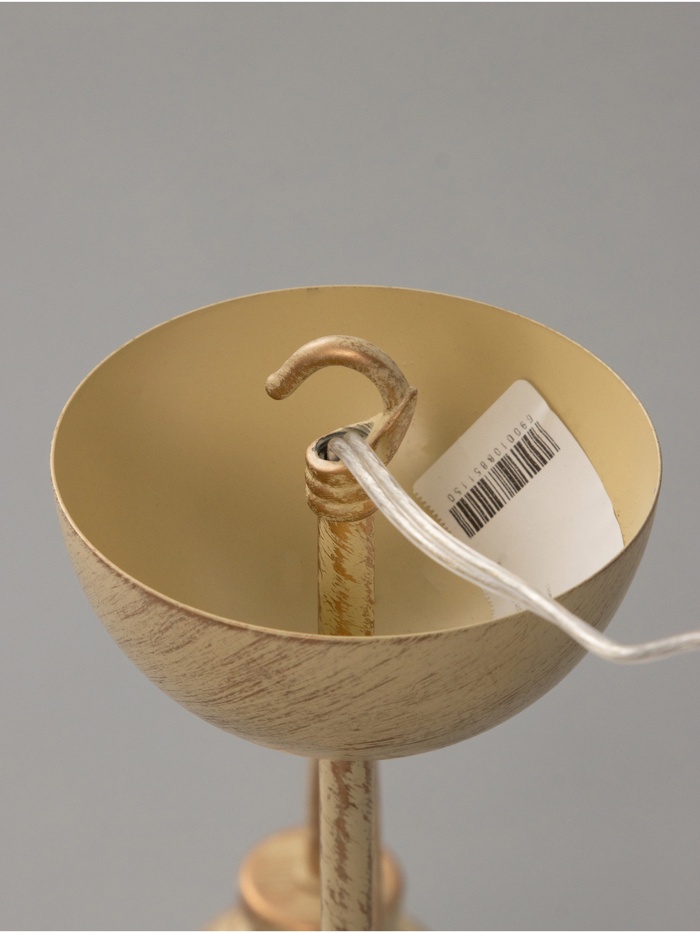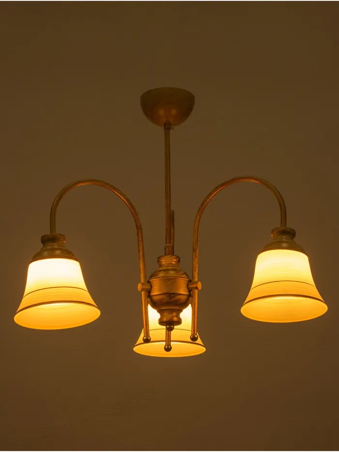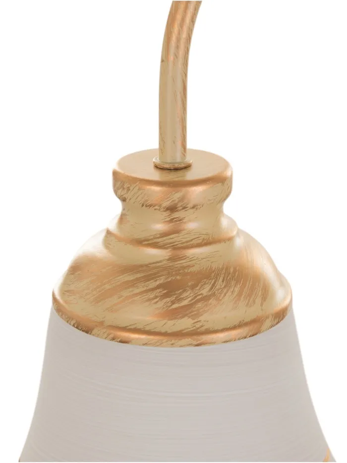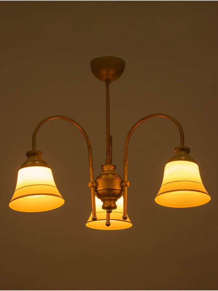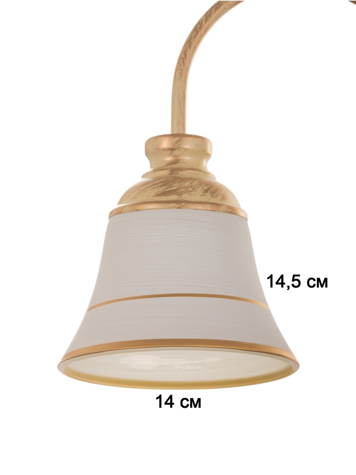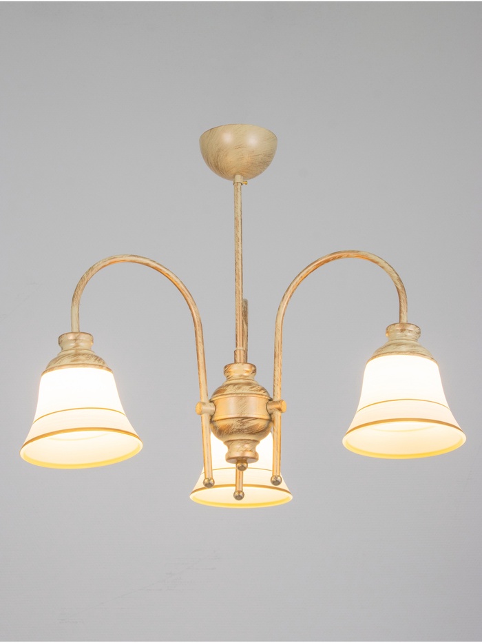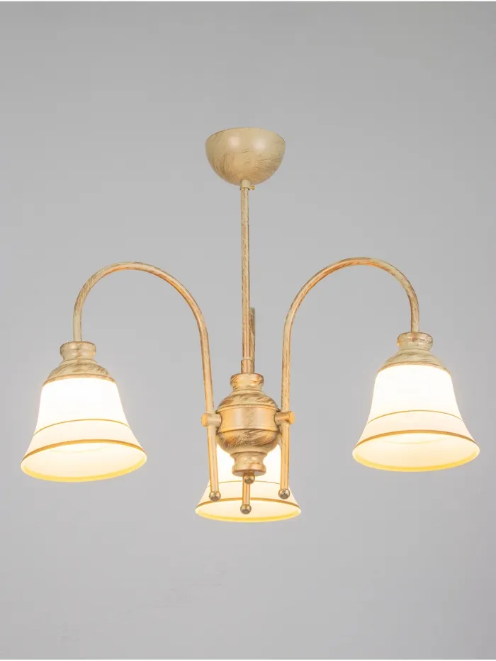 - Дизайн в форме цветка: Золотистое металлическое основание и белые стеклянные плафоны в форме «бокала» с золотистыми вставками формируют композицию, напоминающую цветок. Такой светильник добавляет интерьеру лёгкости и природной гармонии.
