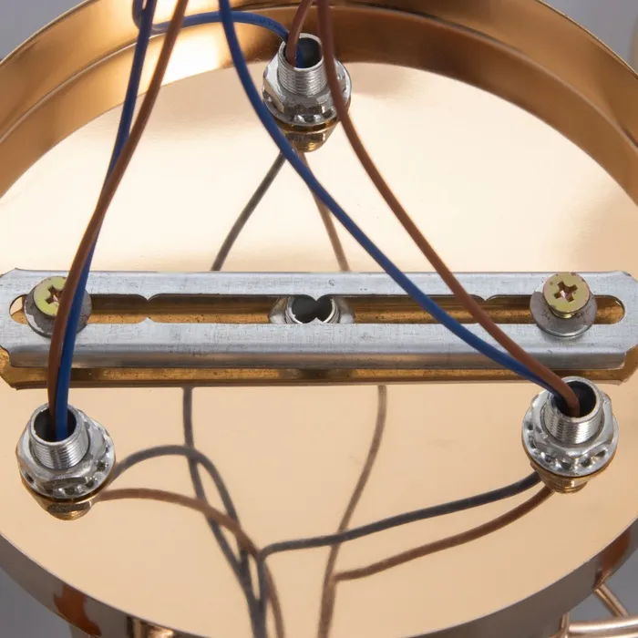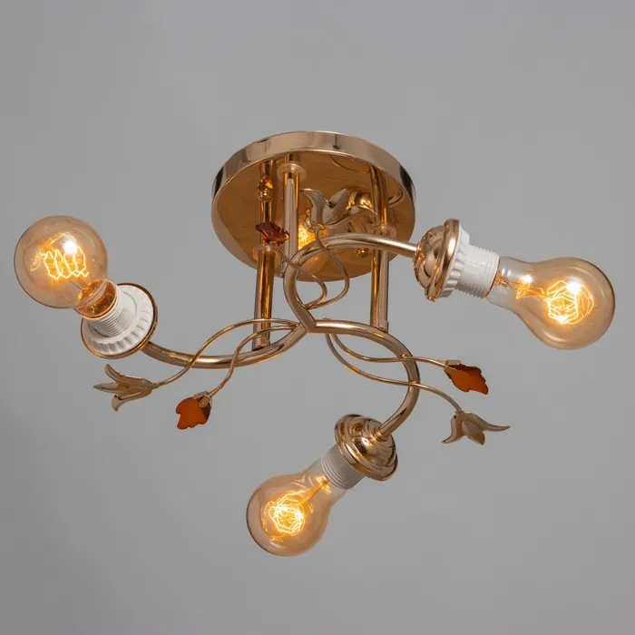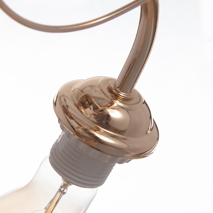 Металлическое основание в золотом исполнении выглядит роскошно. Отсутствие плафонов делает конструкцию легкой и воздушной, акцентируя внимание на самих лампах накаливания.