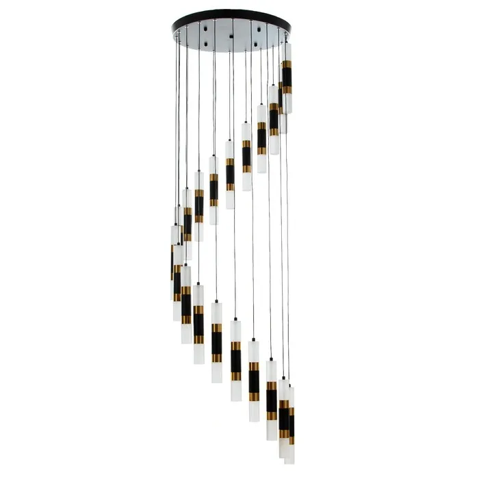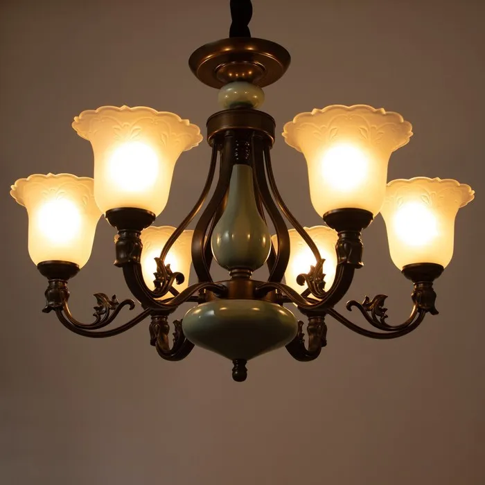 - Мягкое, рассеянное освещение: Шесть ламп с цоколем E27 и мощностью до 40 Вт работают в паре с белыми стеклянными плафонами, направленными вверх. Свет отражается от потолка, создавая равномерное, тёплое свечение — без резких границ, идеально для вечернего времени и зон отдыха.
