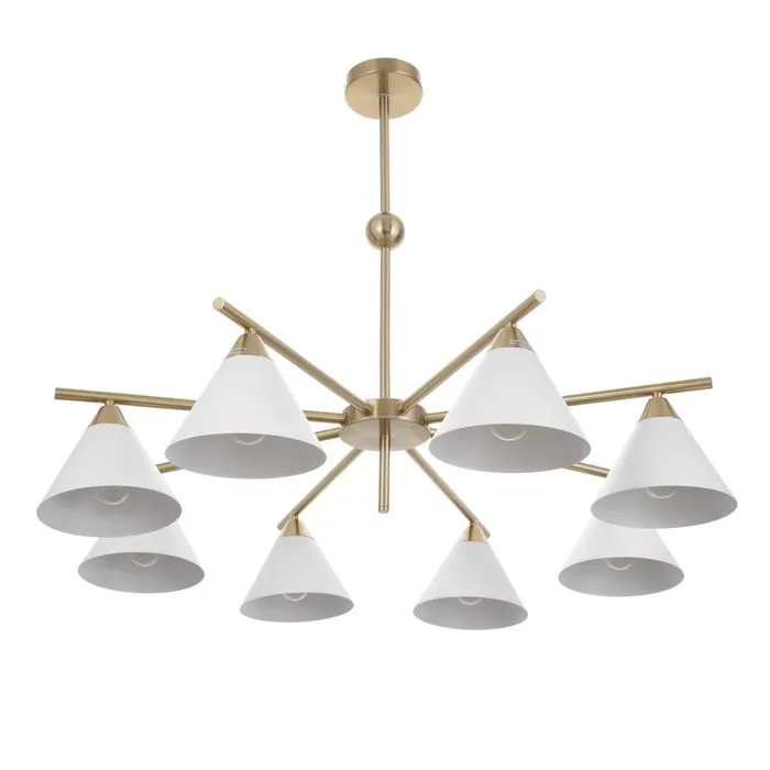 Где раскрывает потенциал: Над обеденным столом в загородном доме, в интерьере кухни-столовой в стиле кантри или в кафе с деревянной мебелью и кирпичными стенами. Белые конусы и природные оттенки металла создают ощущение тепла и порядка. Управление — через настенный выключатель, без пульта. Лампы приобретаются отдельно — это возможность использовать тёплые светодиоды или филаментные лампы для усиления атмосферы. Такой светильник не требует идеального ремонта — он работает в реальном пространстве, где важны и характер, и повседневный комфорт.