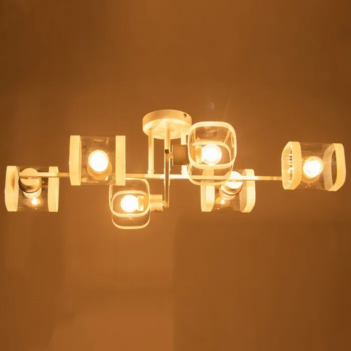 Люстра сочетает в себе практичность и элегантность. Белые прямоугольные плафоны создают мягкий рассеянный свет. Металлическое основание обеспечивает надежность конструкции.
