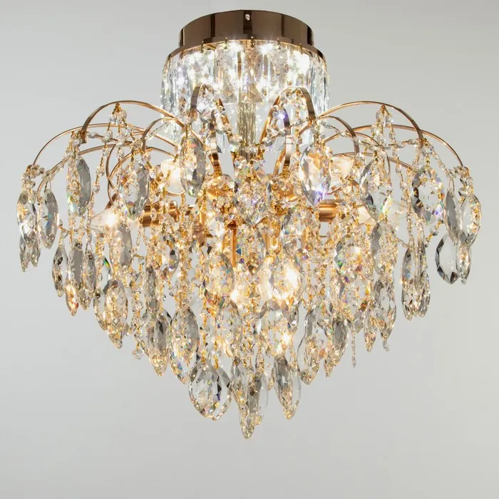 - Цветные стеклянные рассеиватели без плафонов: Форма и оттенки стекла создают эффект перелива света, делая люстру не просто источником света, но и элементом декора в духе хрусталя.