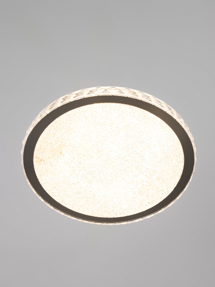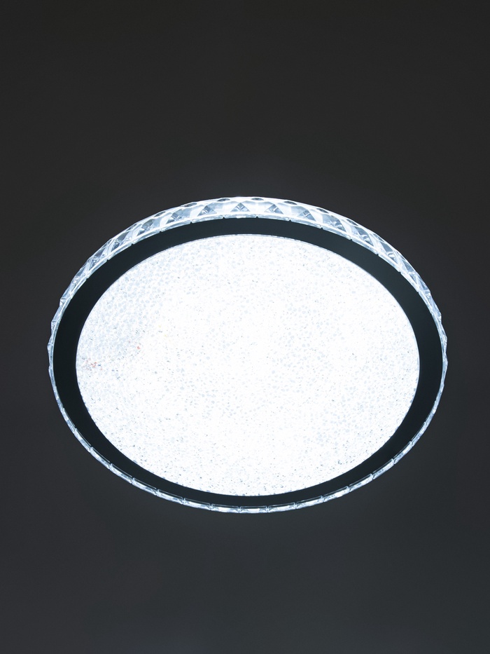 - Стиль, который вписывается везде: Комбинация прозрачного хрома и чёрного металла работает в минимализме, модерне, неоклассике и даже классике. Круглая форма не перегружает потолок, сохраняя ощущение простора.