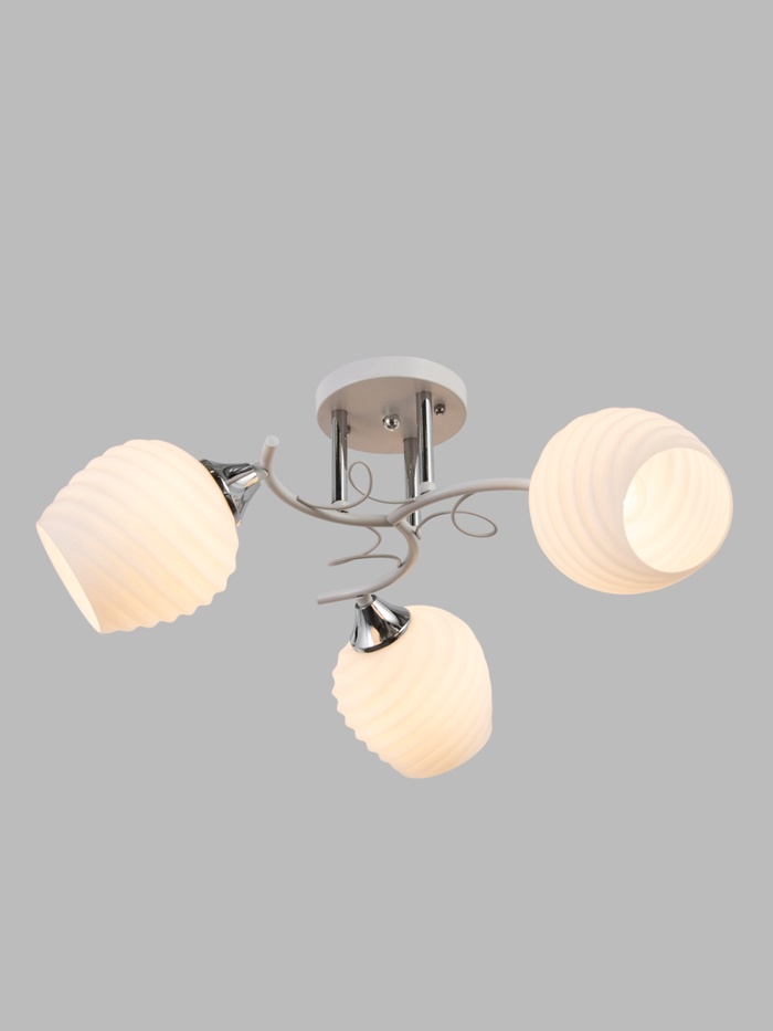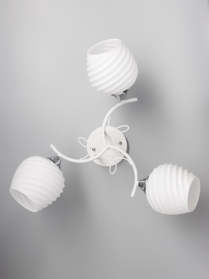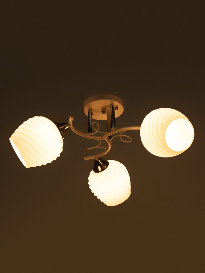 Для тех, кто ищет «люстру белую со стеклянными плафонами» или «трёхрожковую люстру в гостиную»: Эта модель — редкое сочетание классической грации и современной практичности. Стекло легко протирается и не желтеет со временем, металл сохраняет белизну и блеск хрома, а низкий профиль делает её подходящей даже для квартир с потолками ниже 2,7 м. Выберите лампы с тёплым светом — и получите освещение, которое работает незаметно, но всегда точно.