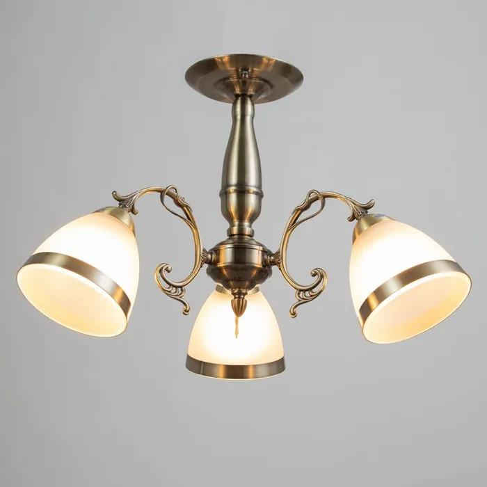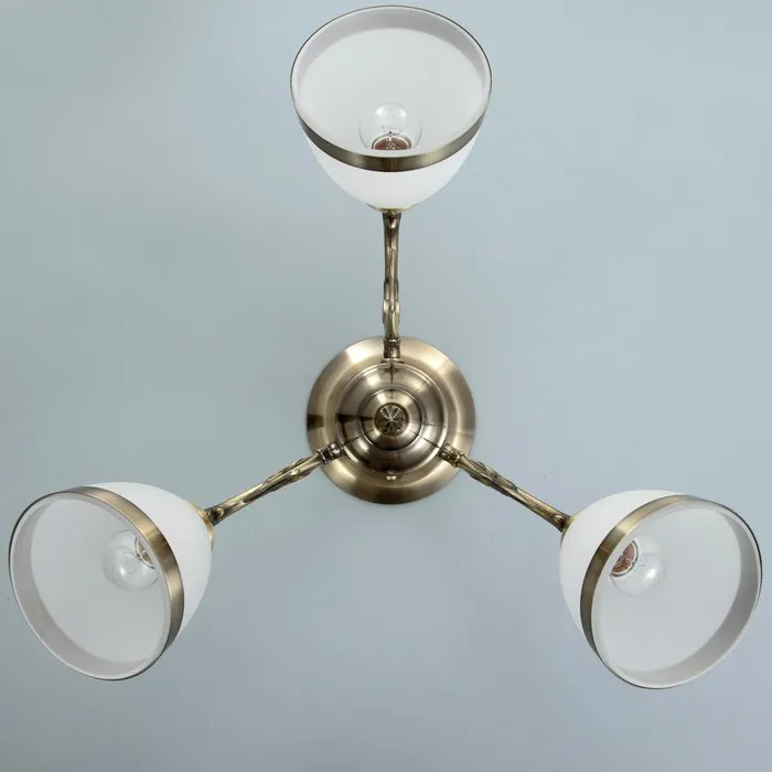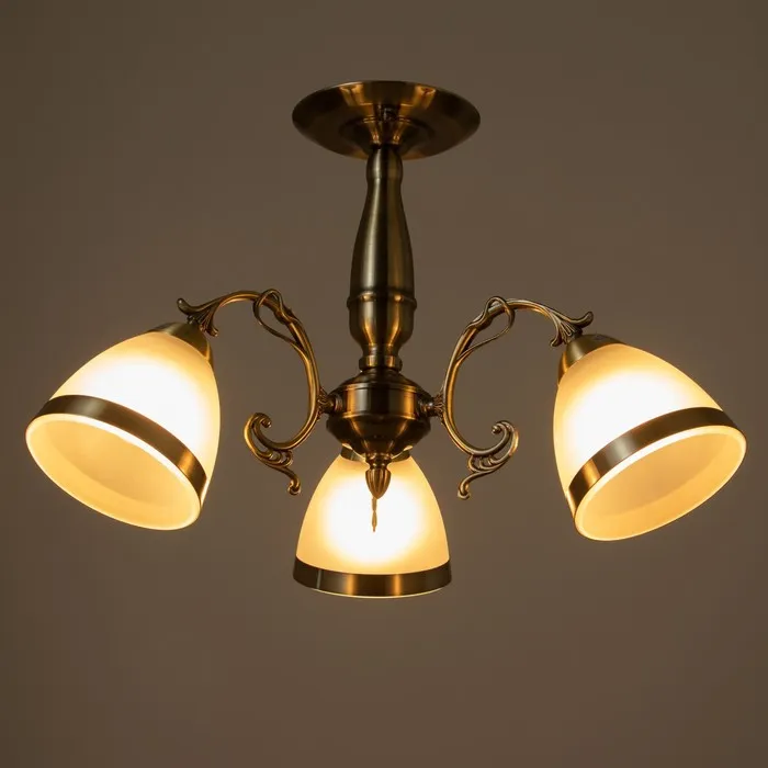 Свет, вдохновлённый классикой и благородством! Потолочная люстра с тремя белыми плафонами и бронзовым каркасом — это сочетание строгости линий и тепла металлического оттенка. Подходит для гостиной, спальни, кухни или прихожей площадью до 9 м², где важны стиль и равномерное освещение.