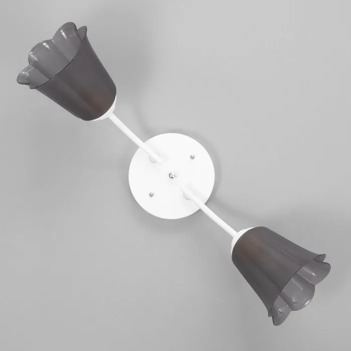 - Минималистичный дизайн: белое металлическое основание и конусообразные полупрозрачные черные плафоны в виде цветка придают люстре стильный и современный вид, идеально подходящий для интерьеров в стиле минимализм.
