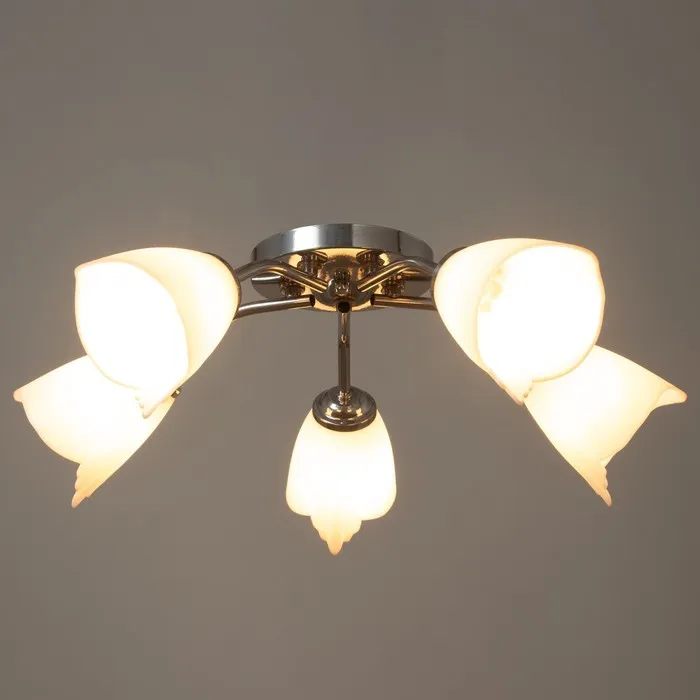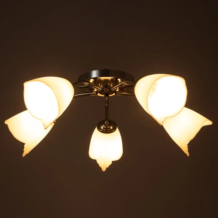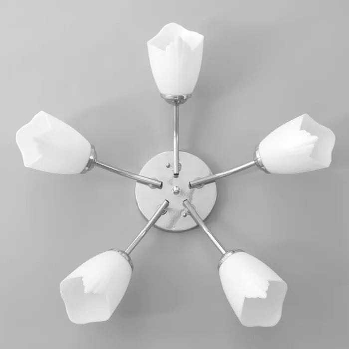 Люстра легко монтируется на планку и подходит даже для натяжных потолков при использовании светодиодных ламп. Направленные в стороны плафоны обеспечивают равномерное освещение без слепящих бликов. Отсутствие пульта управления позволяет интегрировать светильник в существующую систему выключателей.
