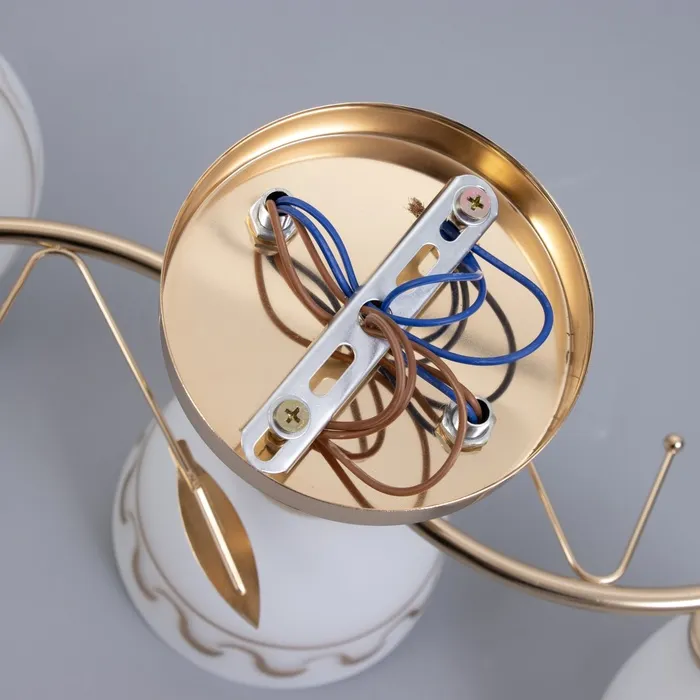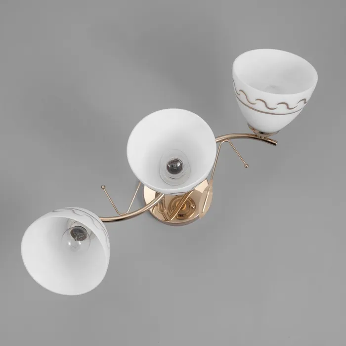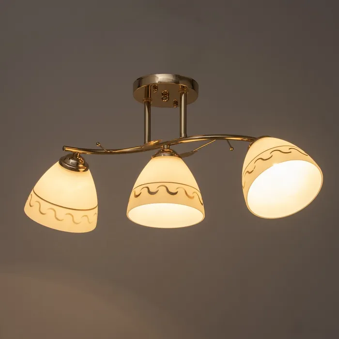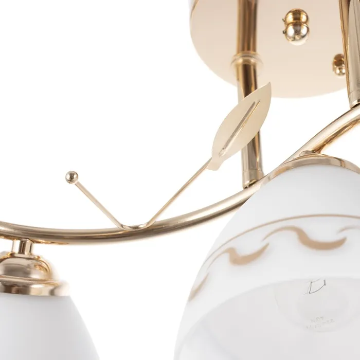 • Создание атмосферы: золотое основание и стеклянные плафоны с узором помогут создать уютную и роскошную обстановку.